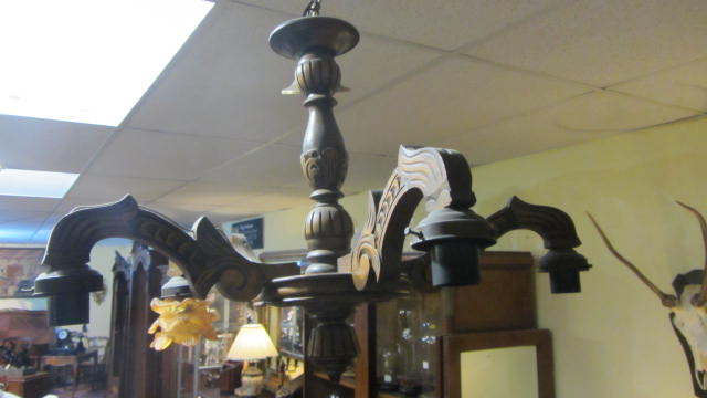 SKU: AQ313 French carved wooden 5 branch light fitting. Needs re-wiring & shades. c1940 Enquiry