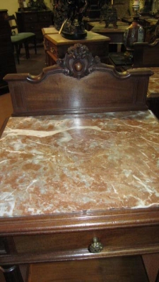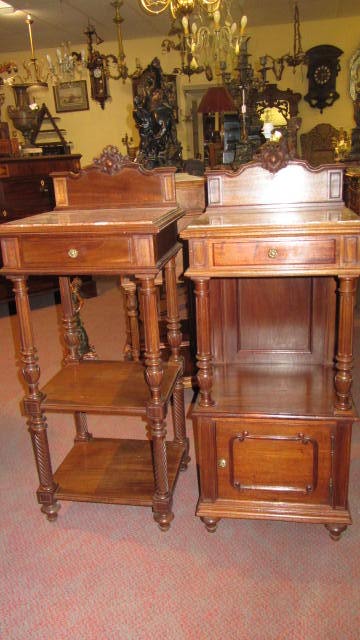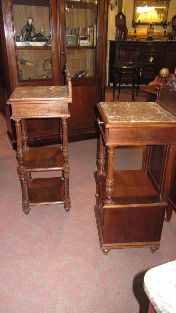 SKU: AS375 Pair of French Marble top Bedside Cabinets, one with tiers and turned and twist supports. c.1900 Equiry Now