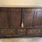 English oak coffer with the front converted to 2 doors. Drawers to base with later Victorian brass handles. c.1770