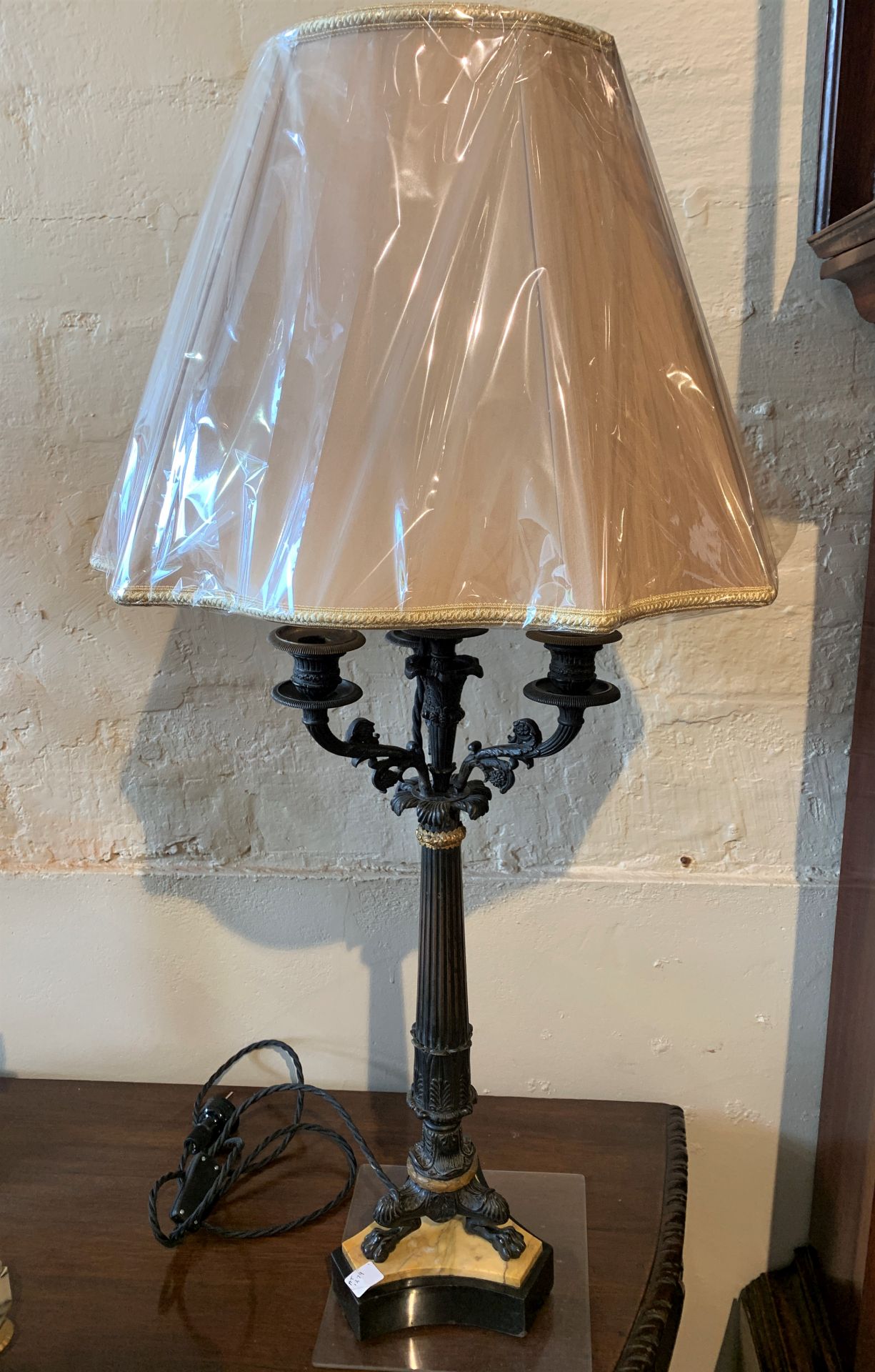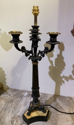 French Empire bronze, ormolu and sienna marble candelabra converted to a lamp base. Shade additional cost.