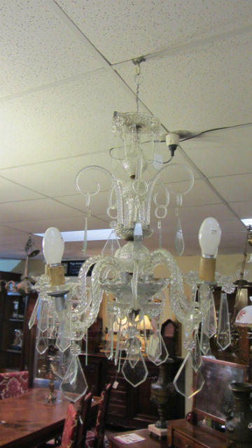 SKU: ZZ1500 5 Branch Chandelier with twisted decorative arms and candy canes .Cut glass kite shaped drops.c.1940 Needs re-wiring Enquiry