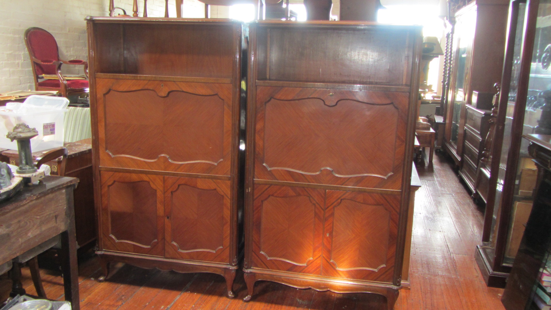 ‘ One of a pair of rosewood and kingwood fall fronted secretaire bookcases c.1910