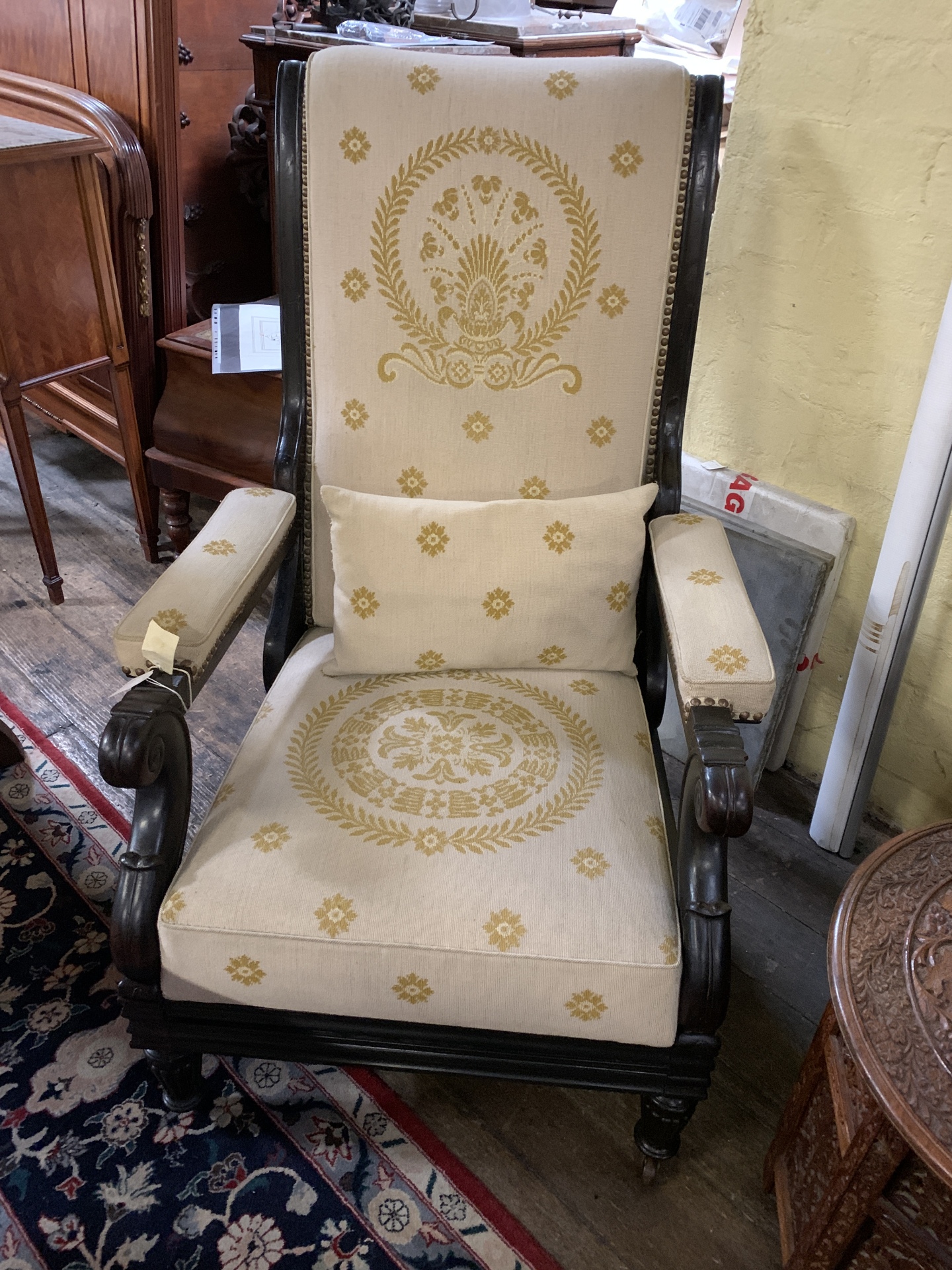 French early 19th century dark stained mahogany library chair with quality upholstery and a small matching cushion.
