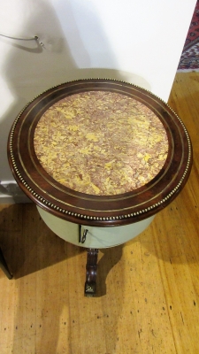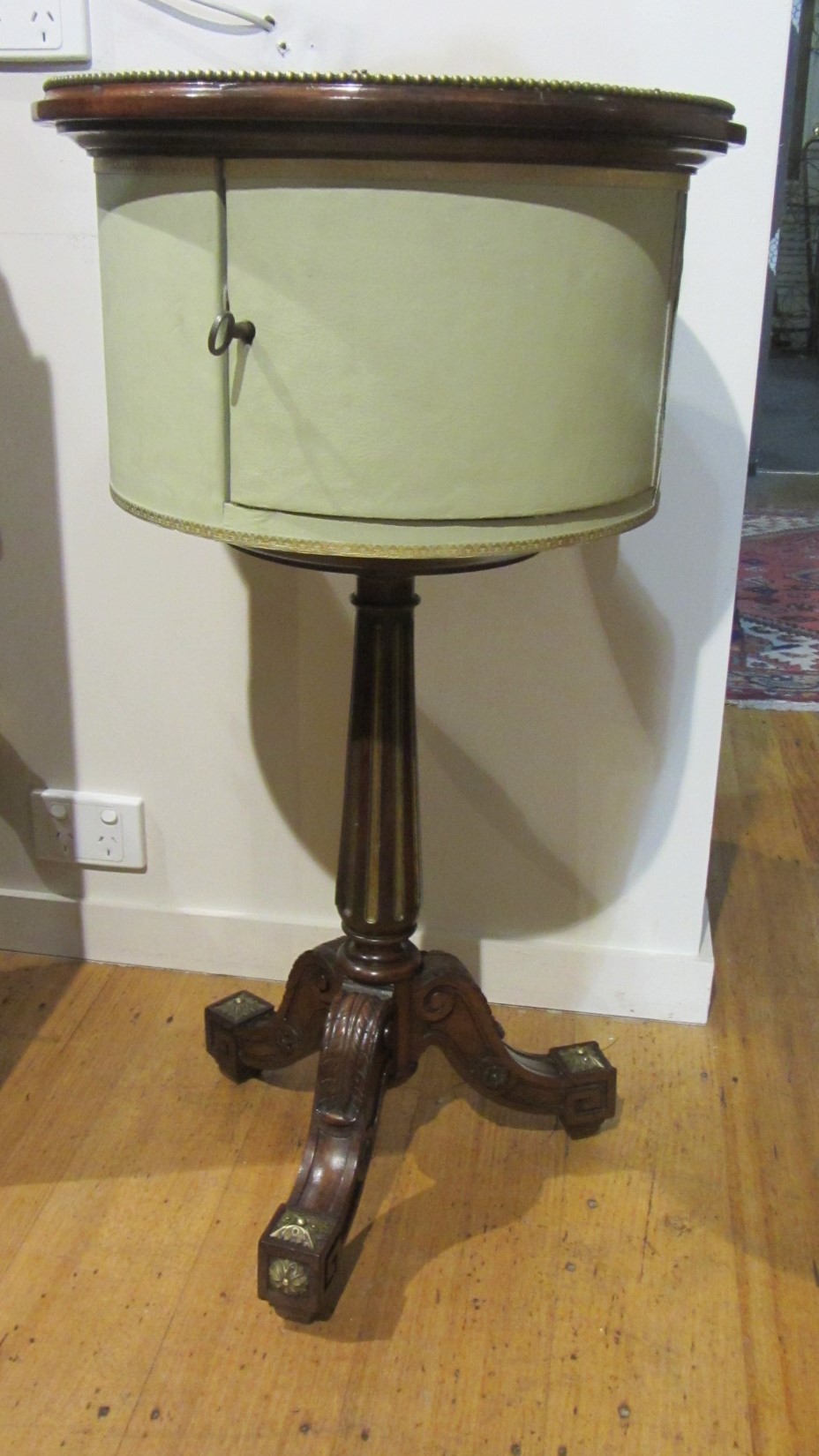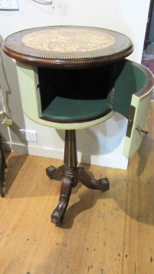 Circular, rosewood and brass inlaid lamp table with leather clad storage area and lovely tripod base. c.1850