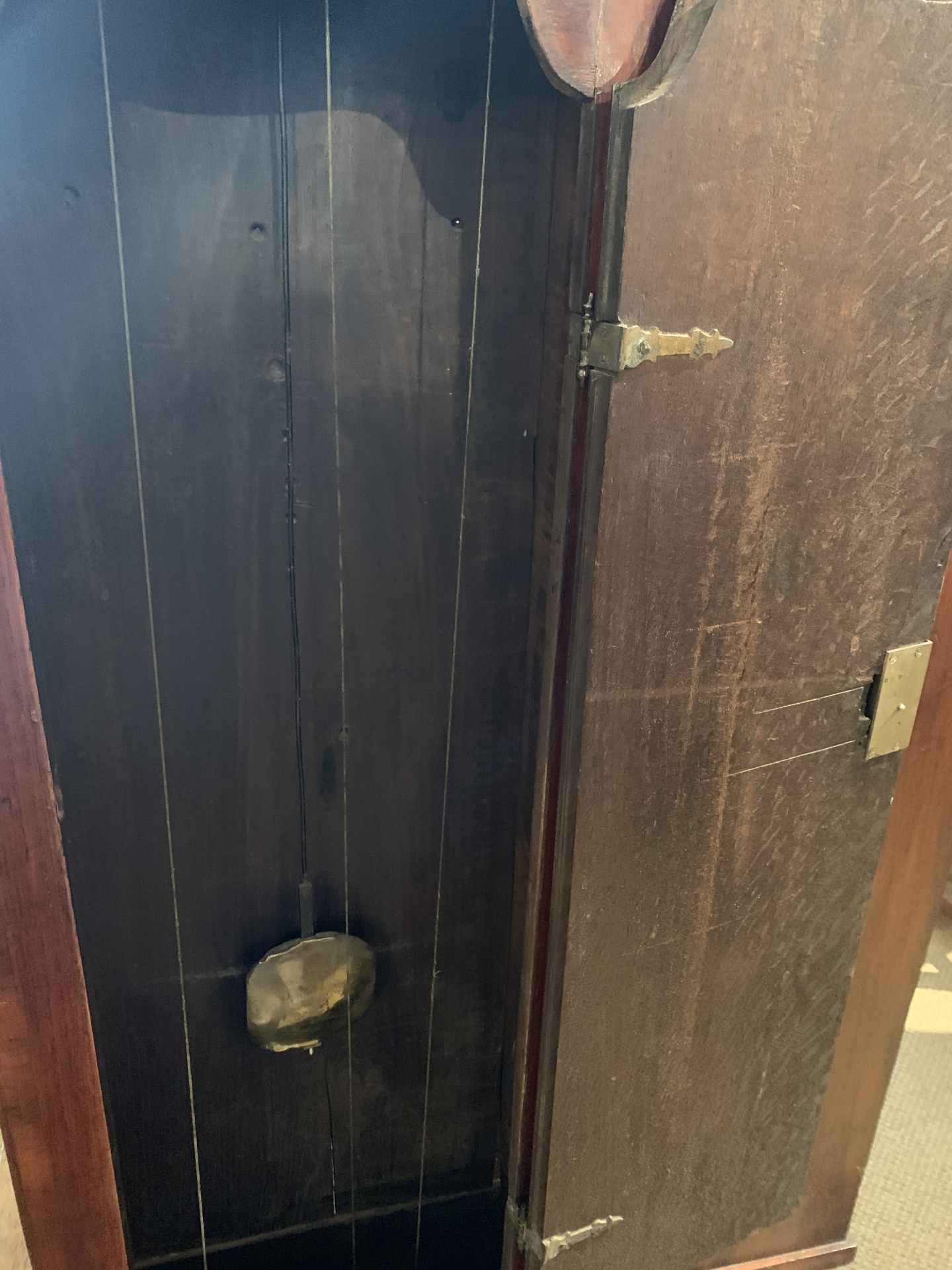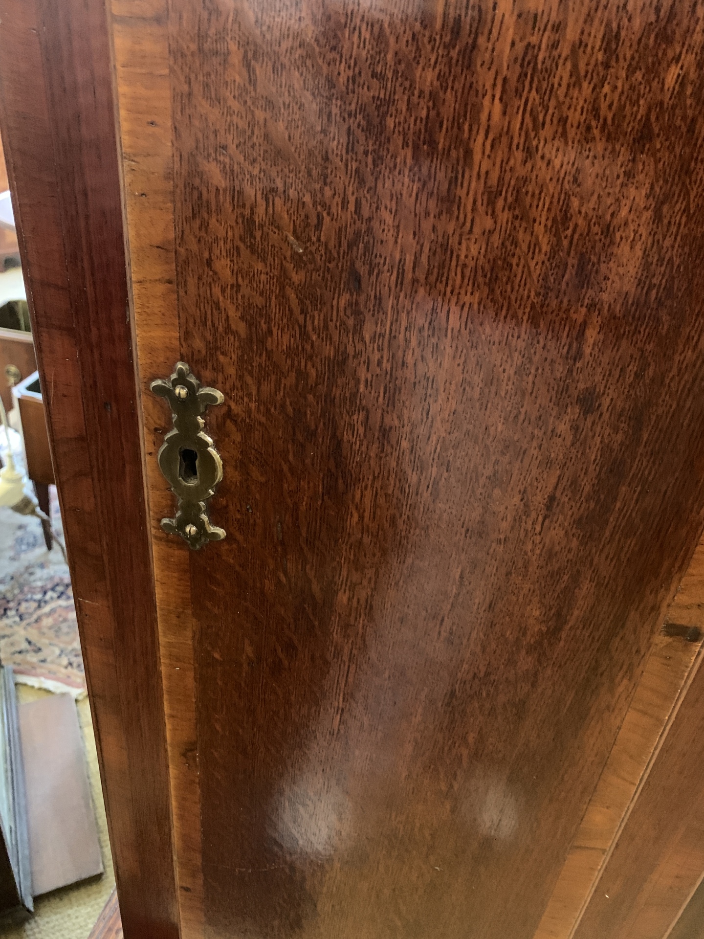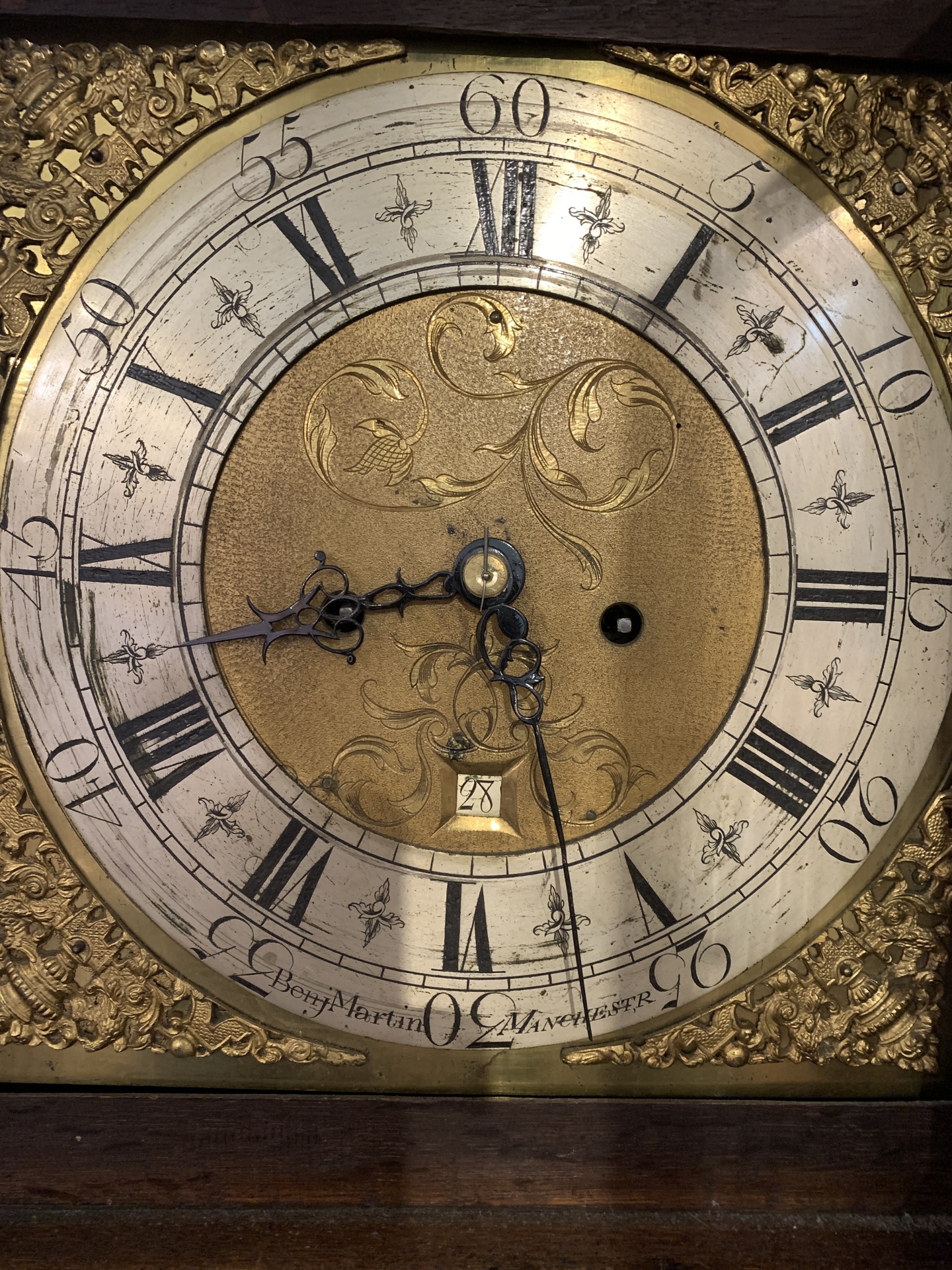 Georgian oak longcase clock with walnut crossbanding, shaped trunk door and silvered dial with gilt spandrels.