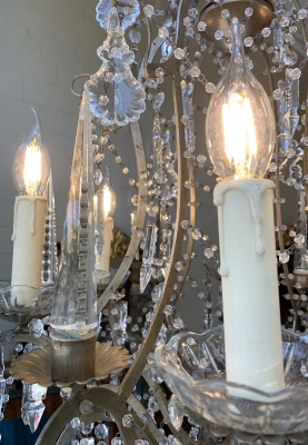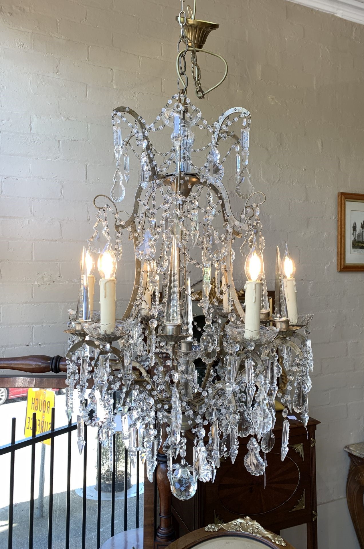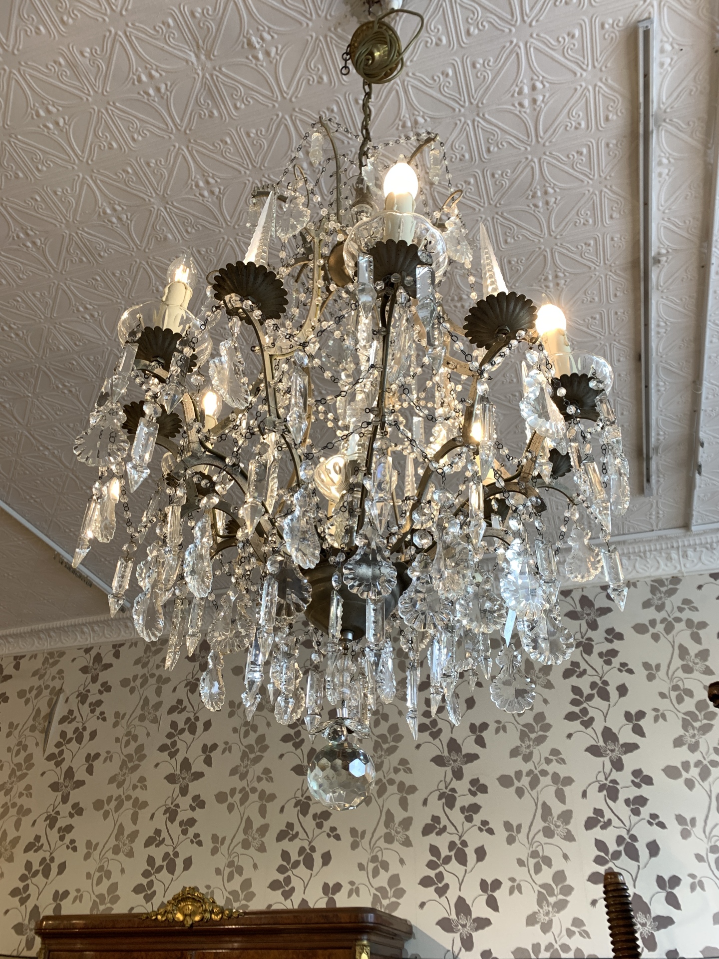 French crystal and metal framed 12 branch chandelier ( 6 lights) – branches alternating with lights and obelisks. Also swags and lustre drops. Rewired . c.1920