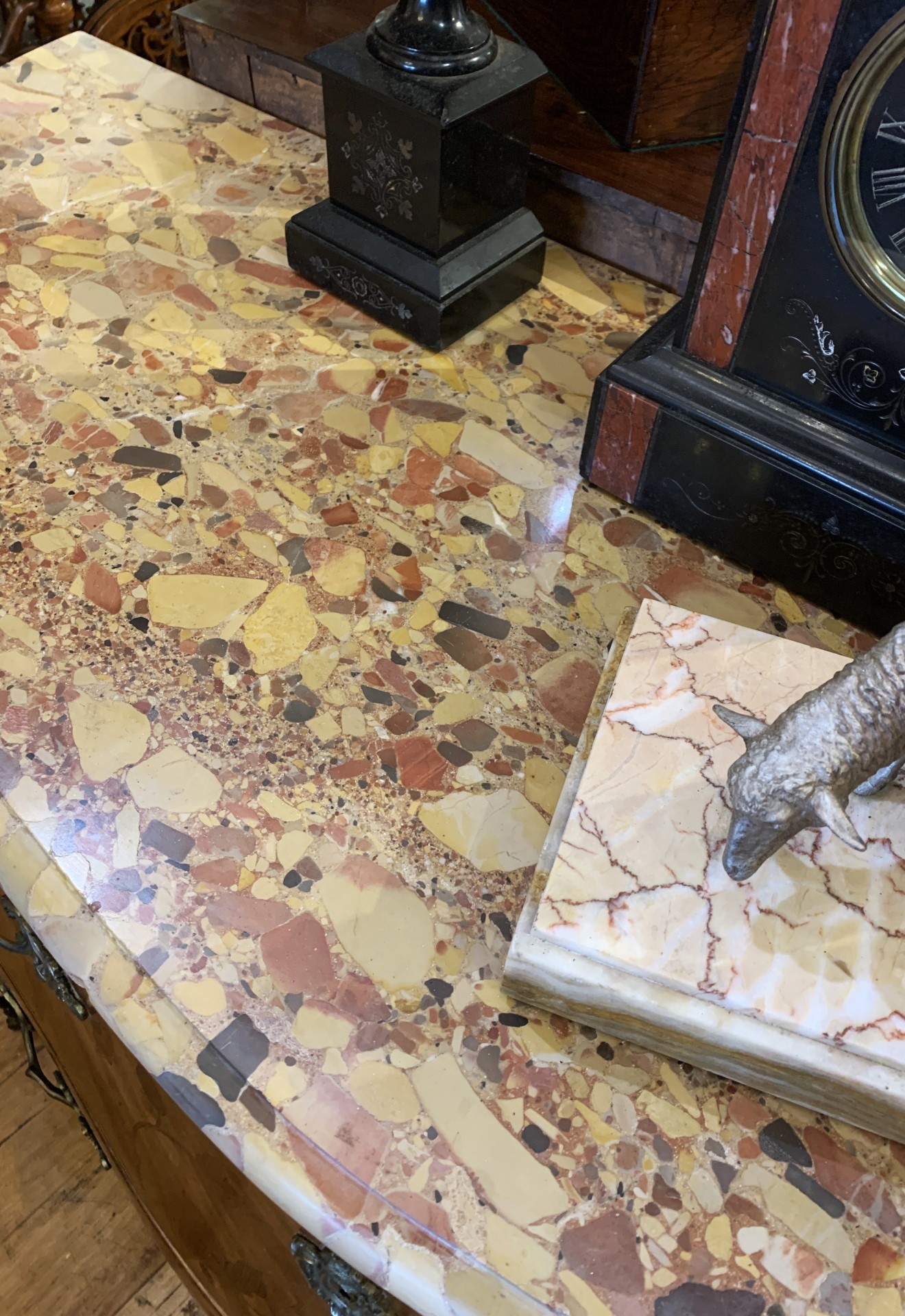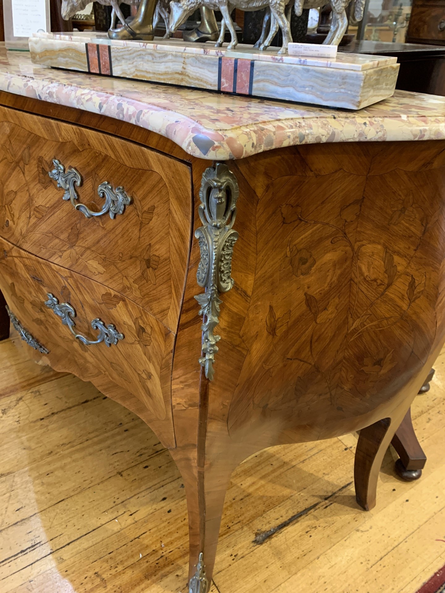 French Louis XV style kingwood and floral inlaid commode with Breche de Alep marble top and brass mounts.c.1920-30