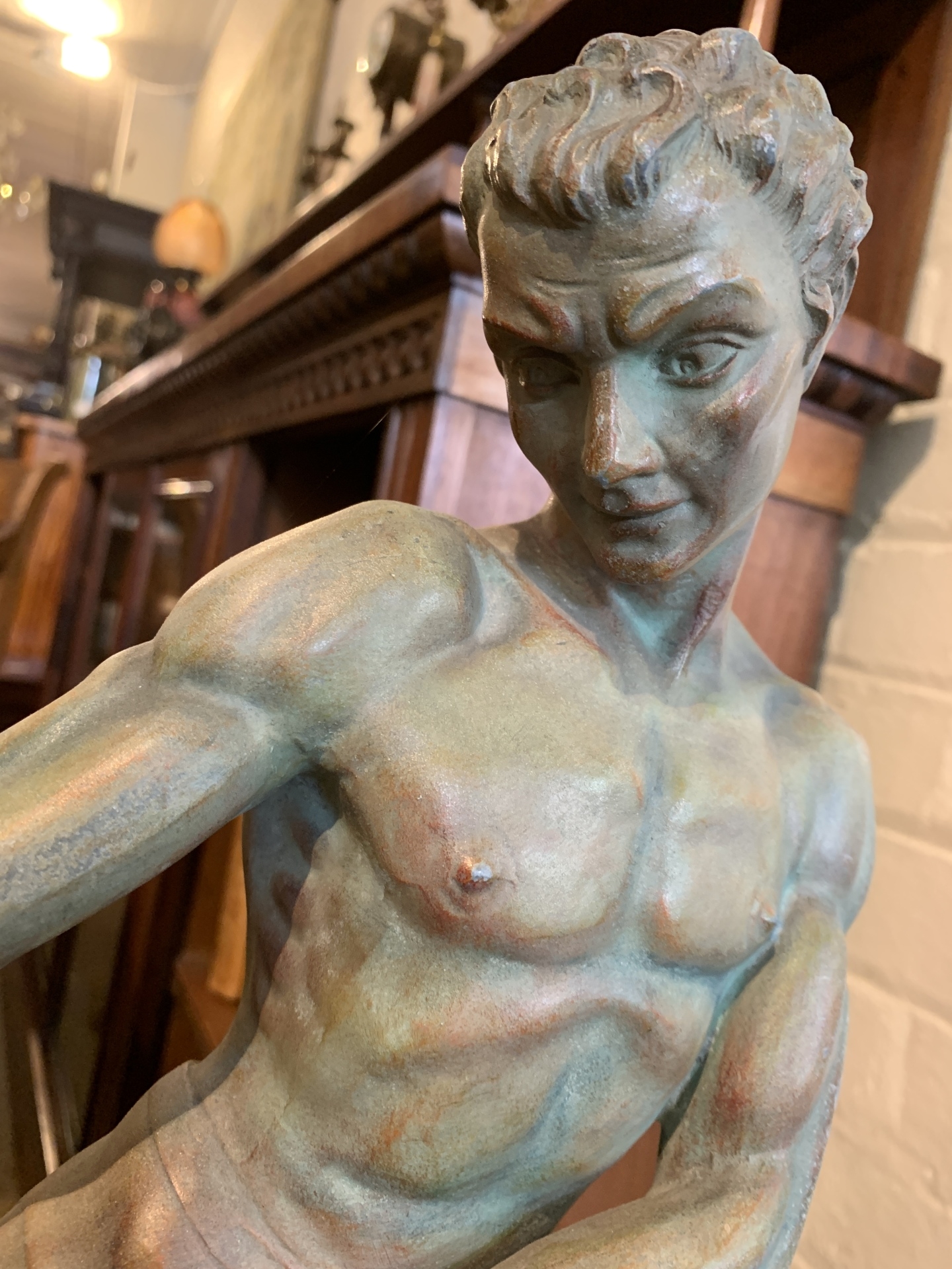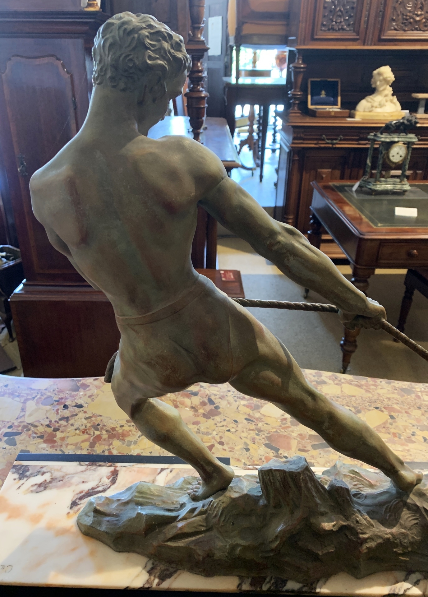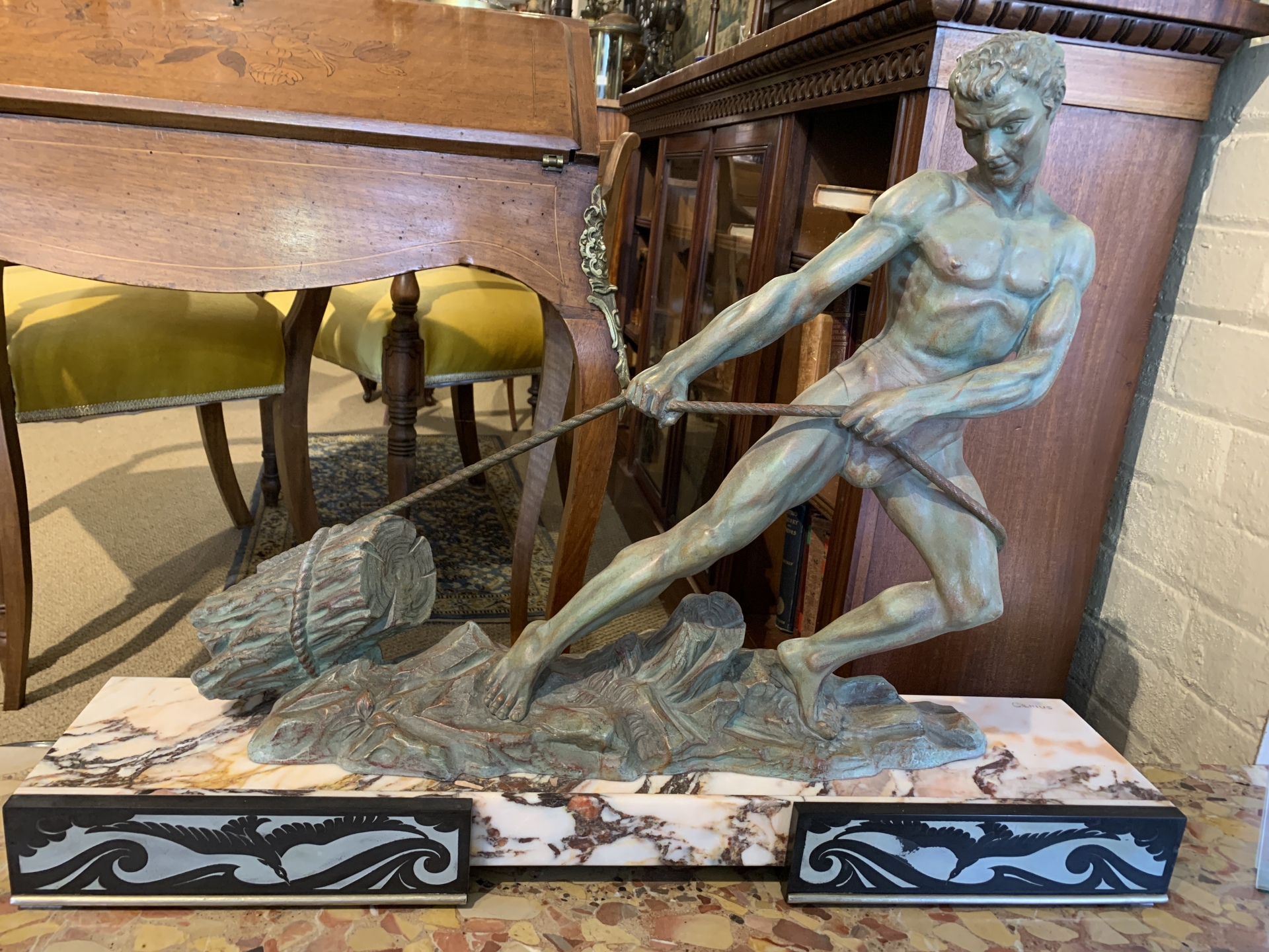 French Art Deco spelter figure of a man pulling a log on an impressive marble base. c.1930