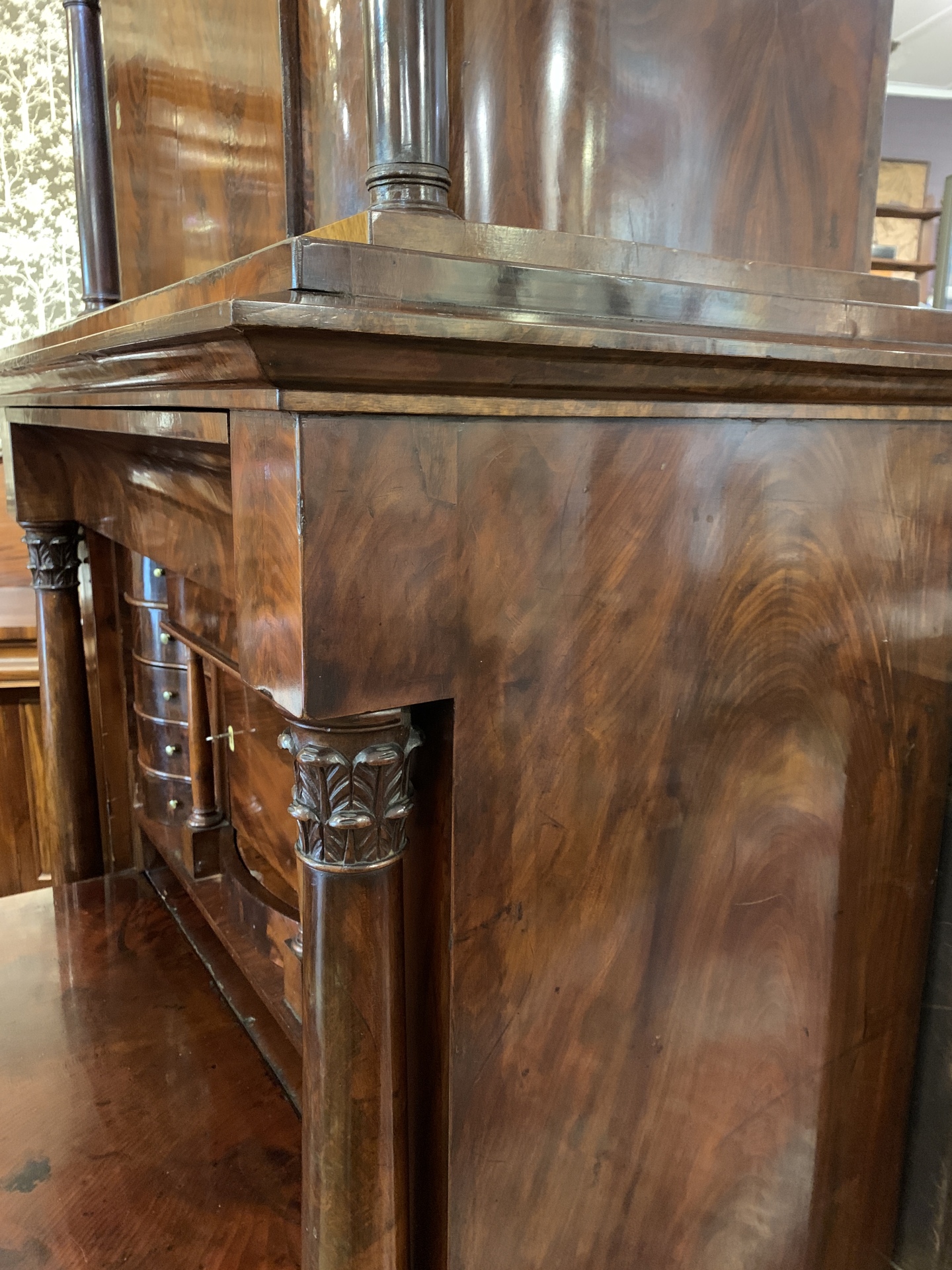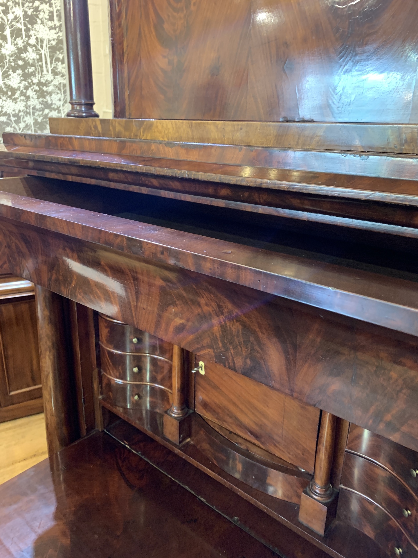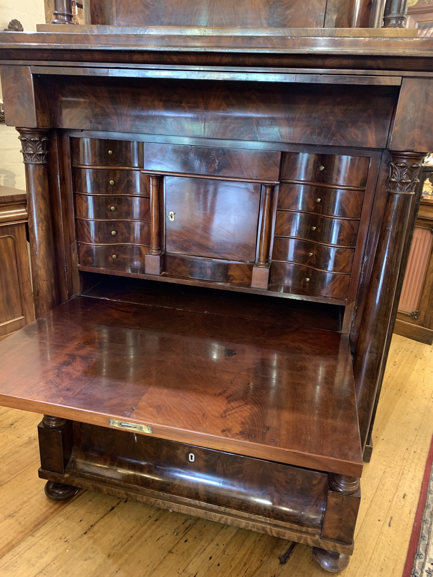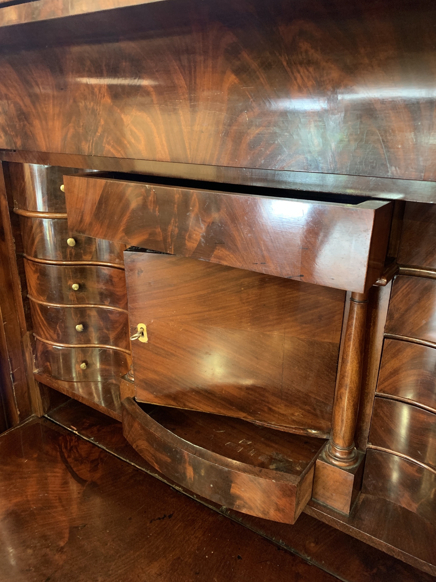 !9th century Biedermeier flame mahogany secretaire a abbatant with drawers and a fall front containing extensive internal fitted and shaped drawers. Mother of pearl escutcheons, corinthian columns and a raised cupboard to top. c.1850