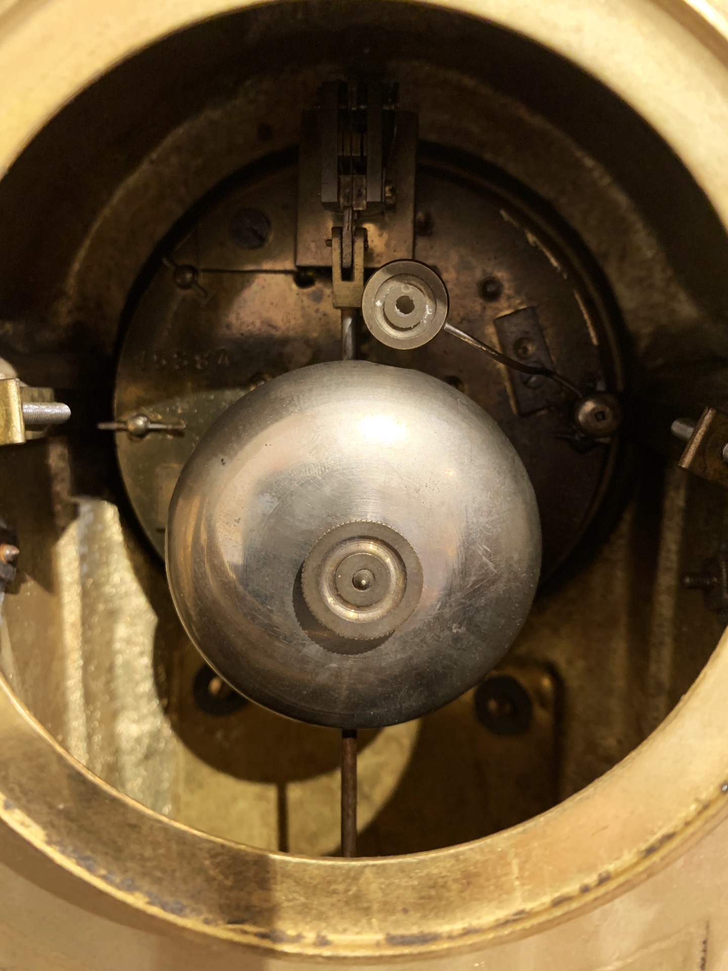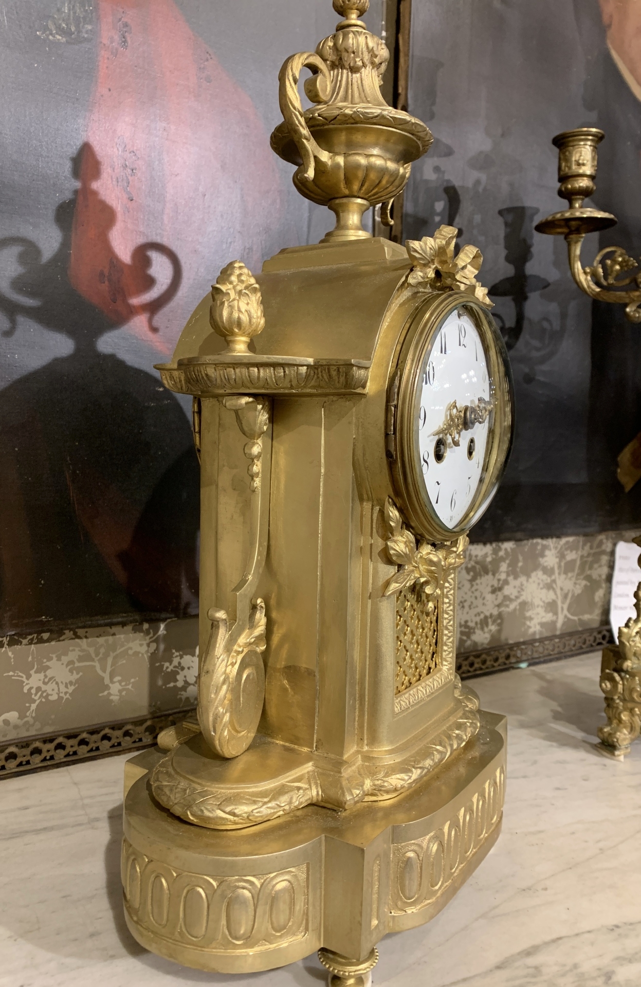 French ormolu 8 day clock with enamel dial and Arabic numerals with an architectural style plinth & decorative urn to top. c.1890