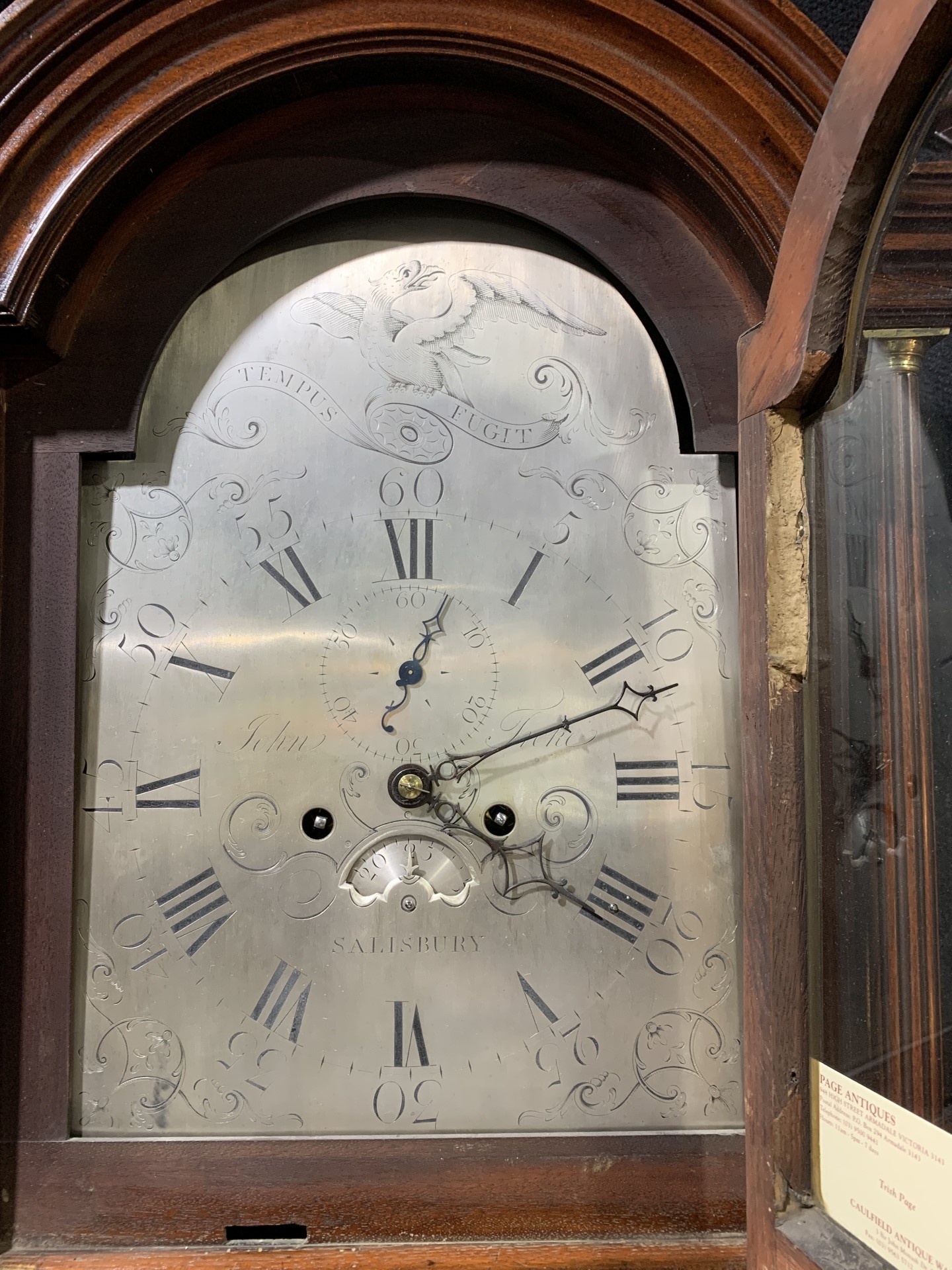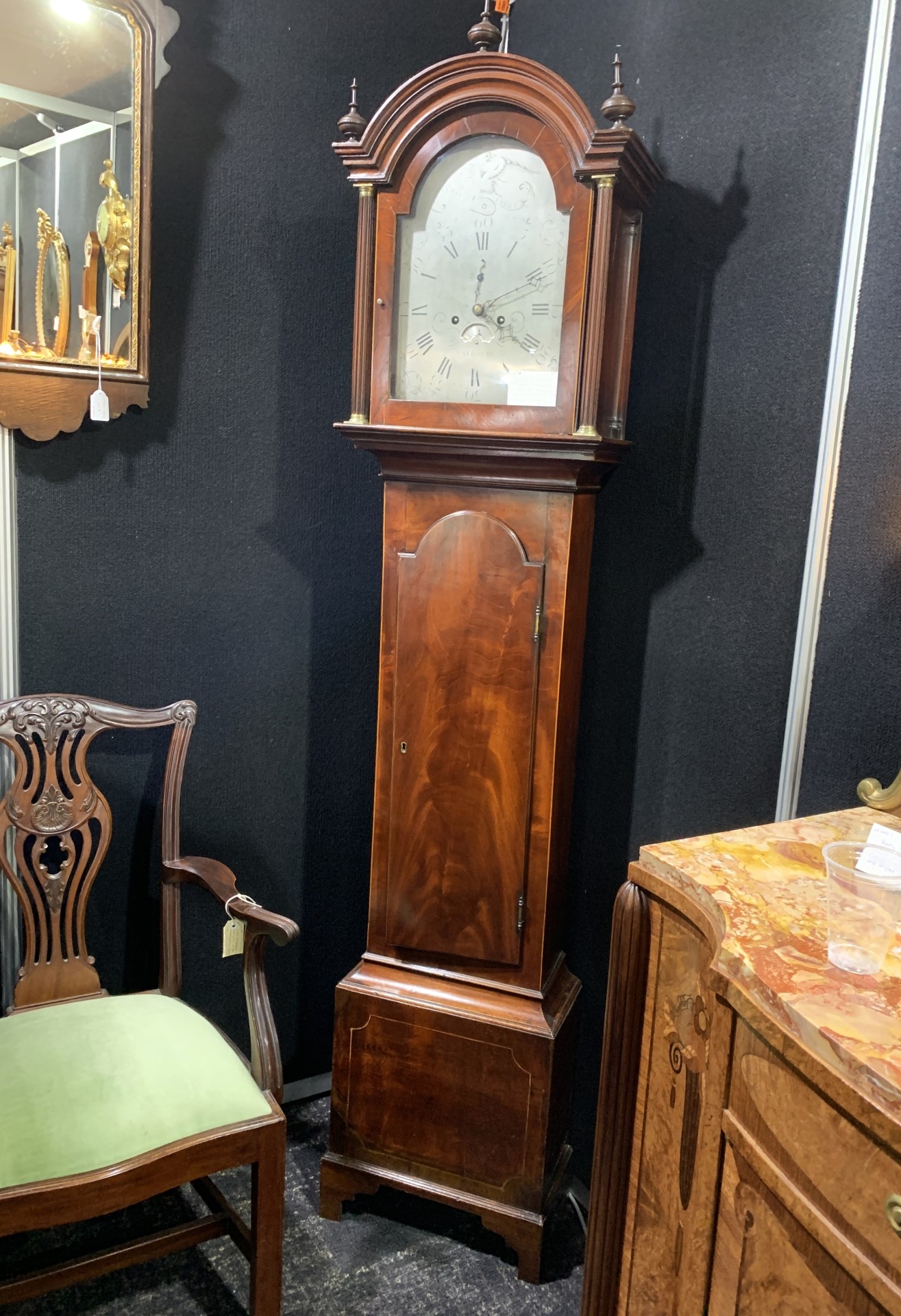 Georgian flame mahogany 8 day long case clock with string inlay to edges and a silver dial. Salisbury retailer. c.1800 Movement serviced.