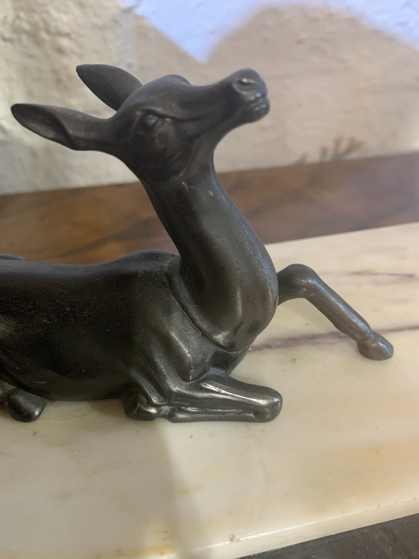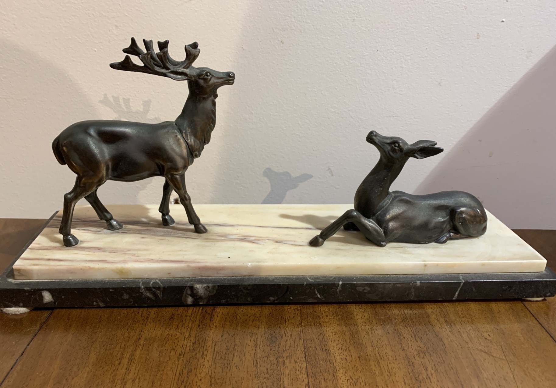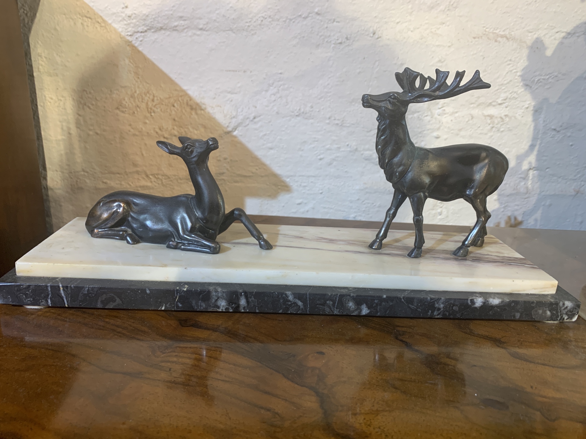 Art Deco Spelter deer group of stag and doe on layered cream and black marble c.1930