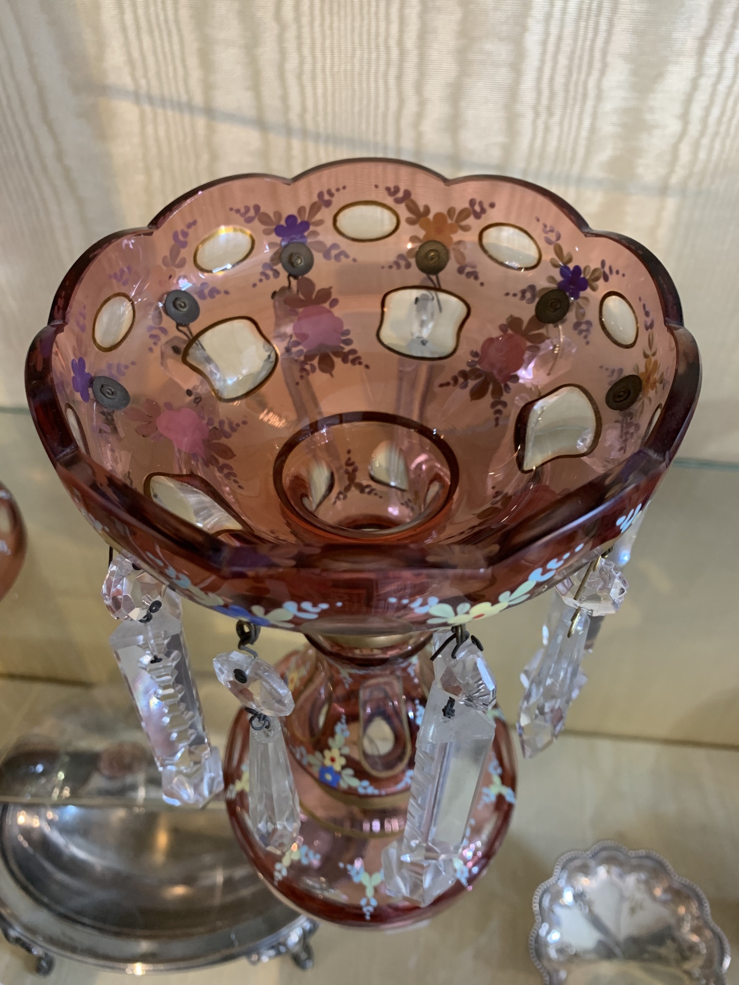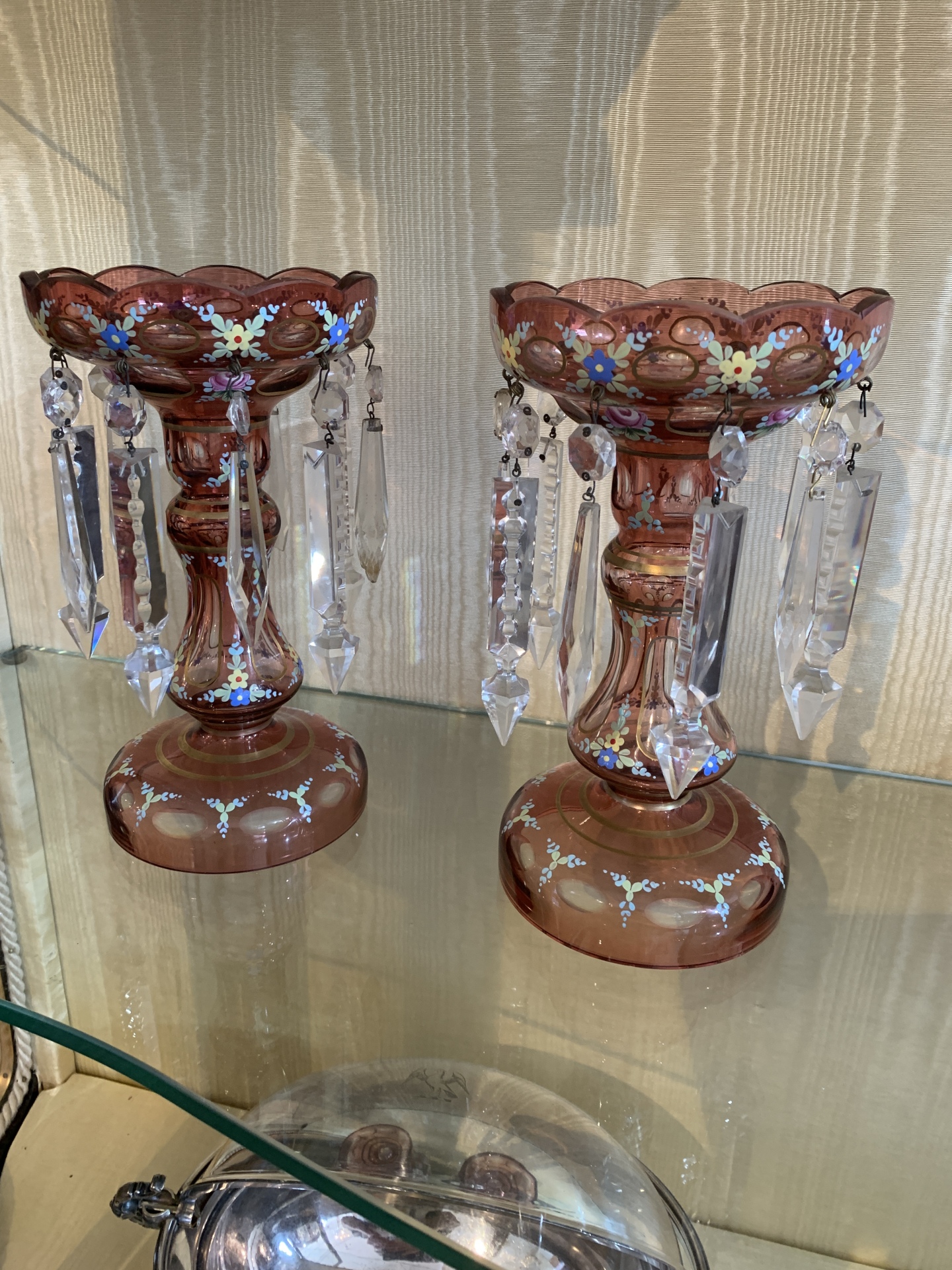 Pair of Bohemian lustres with Cranberry overlay and gilt and floral decoration.