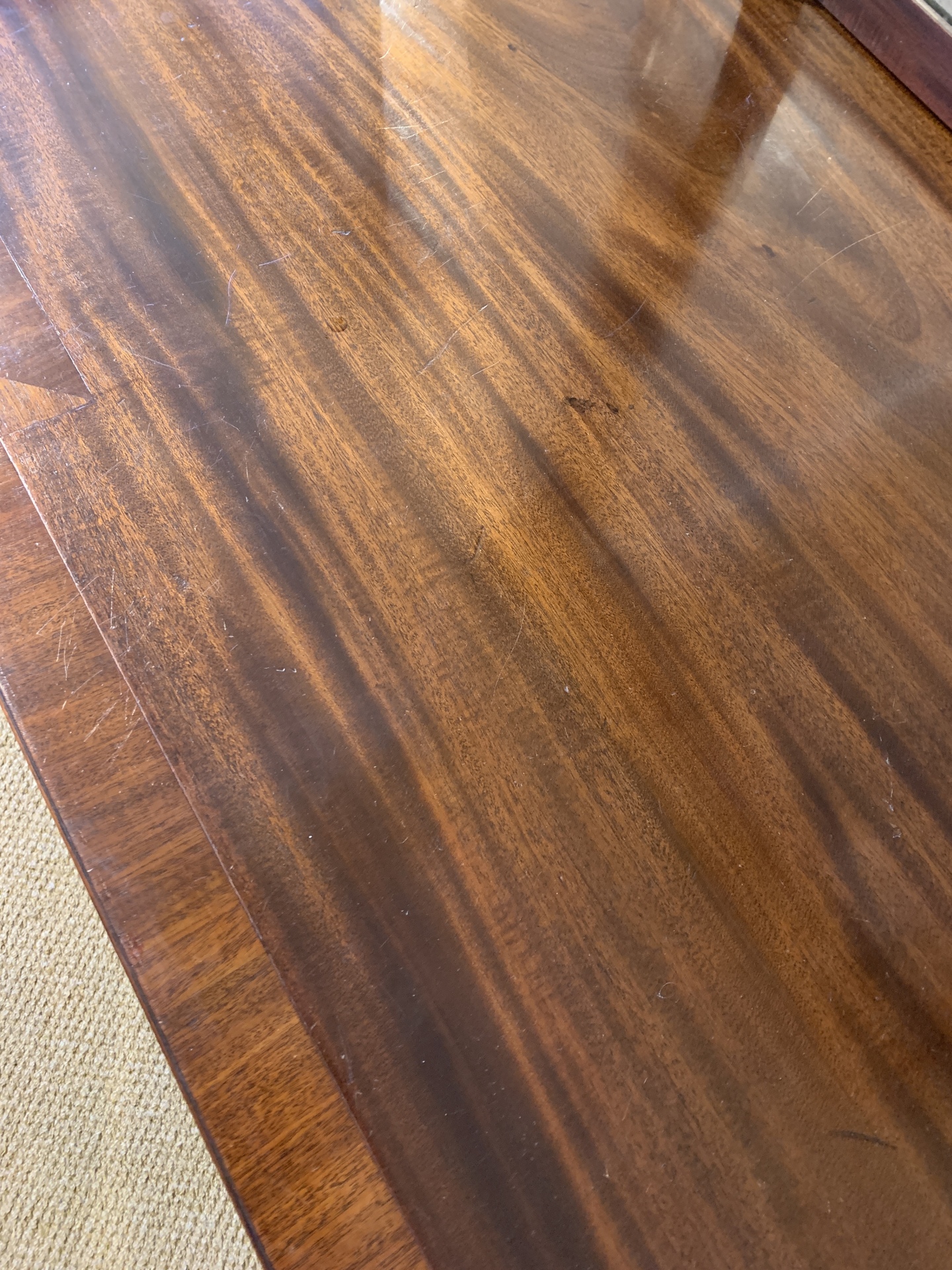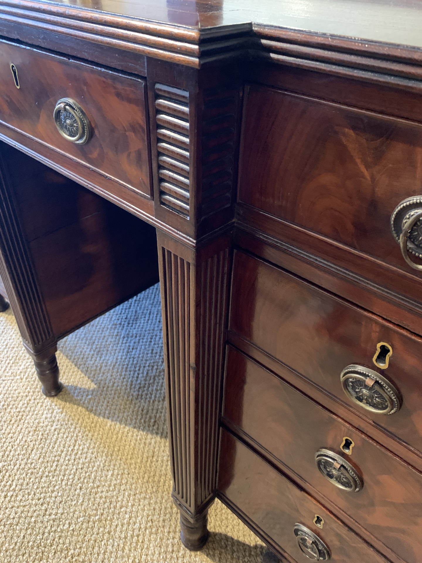 Georgian mahogany break front knee-hole desk with 9 drawers and on short turned baluster legs.