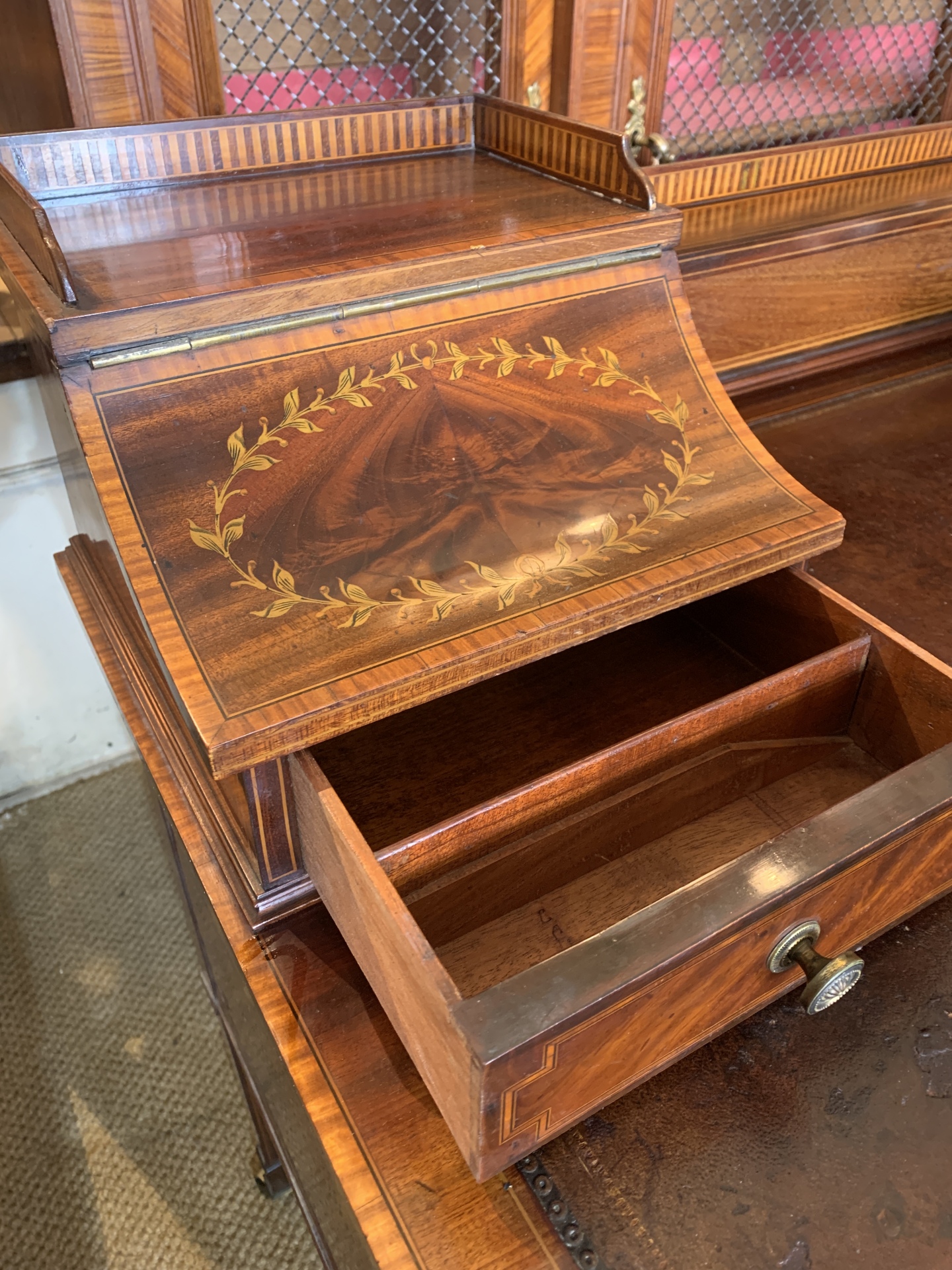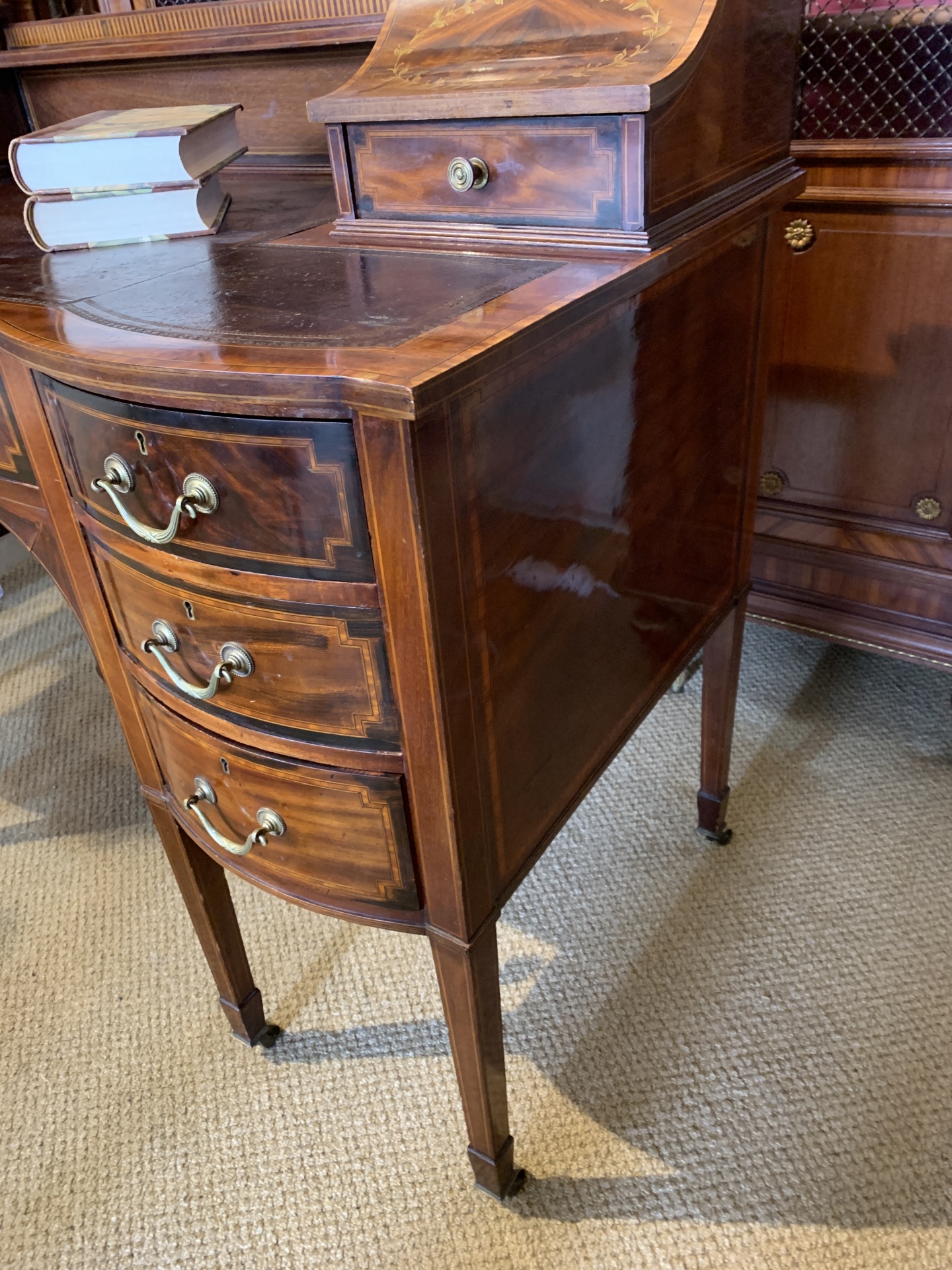 Late Victorian Sheraton Revival mahogany and inlaid writing desk with 7 drawers on square tapering legs,a leather inset to top and a shelf flanked by 2 inlaid banks. c.1890