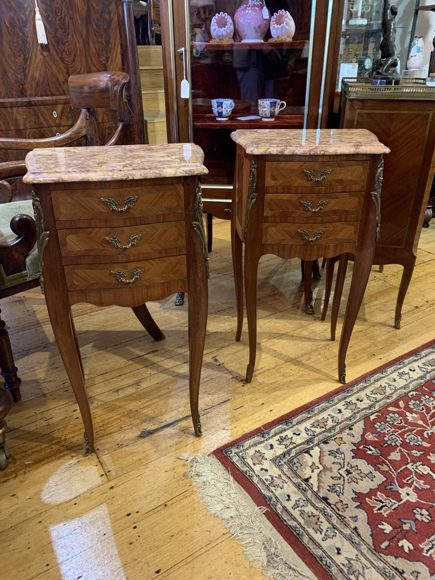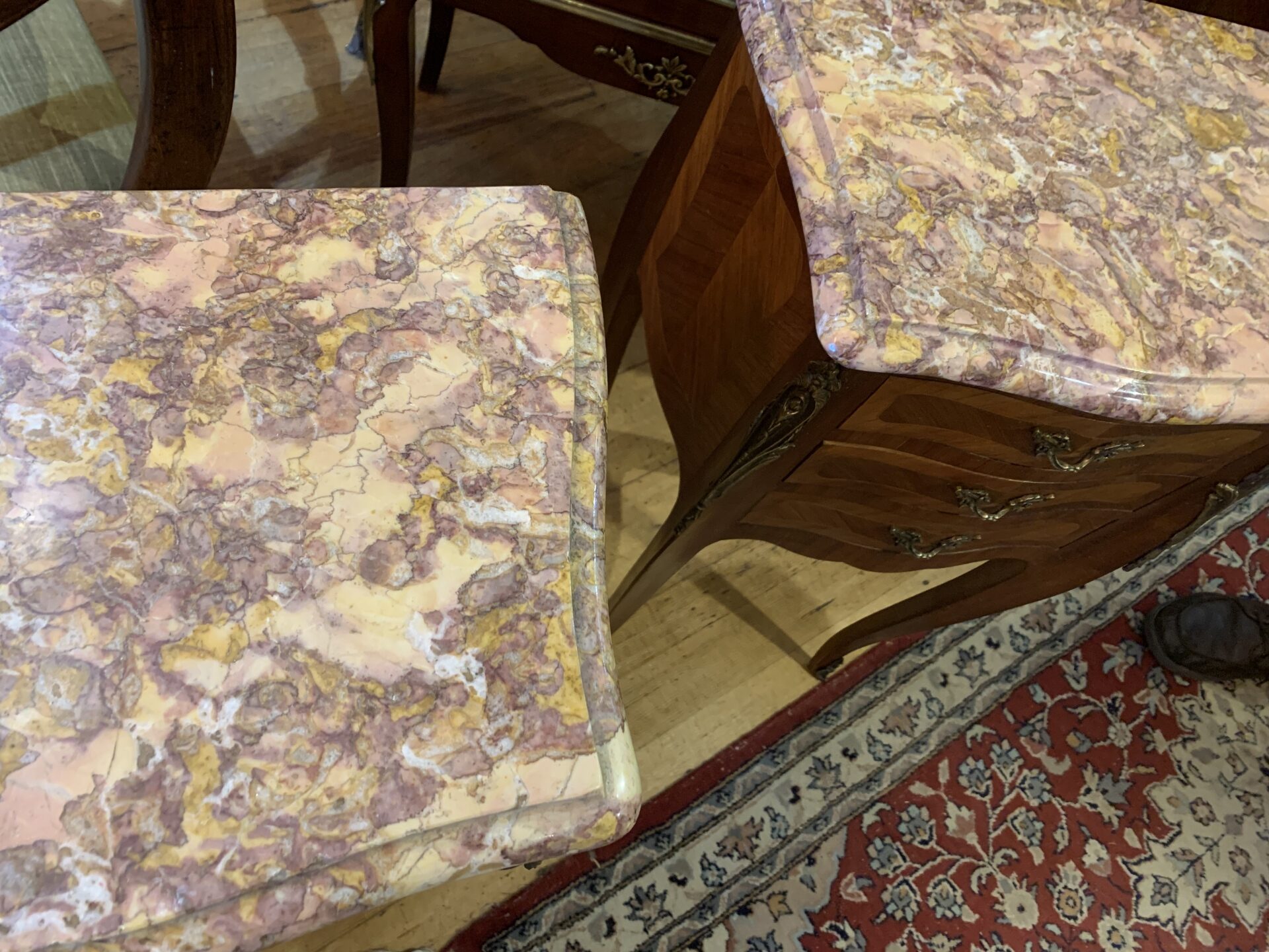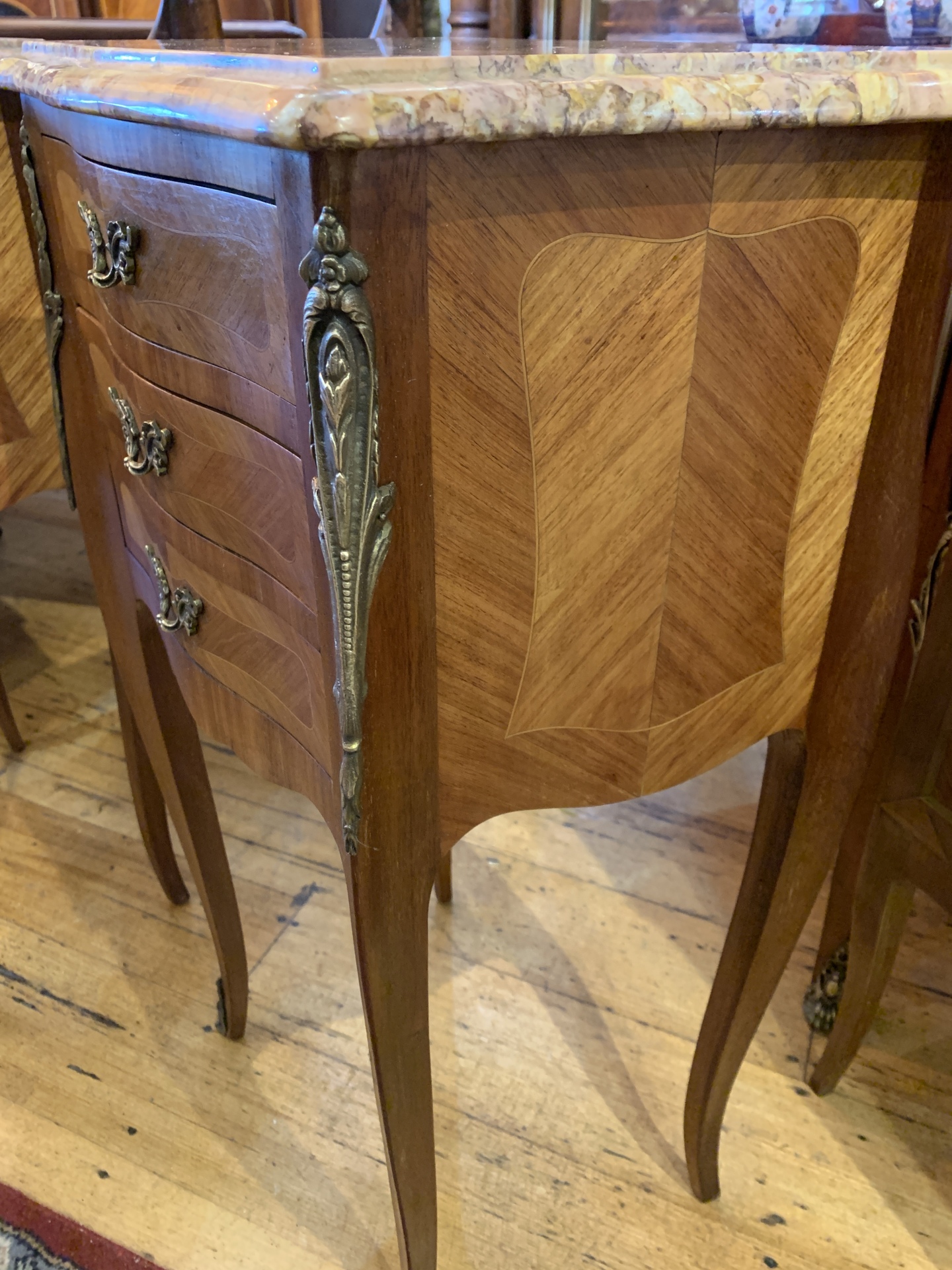 Pair of marble top king wood bedside chests in Louis XV style with brass mounts and handles. c.1930