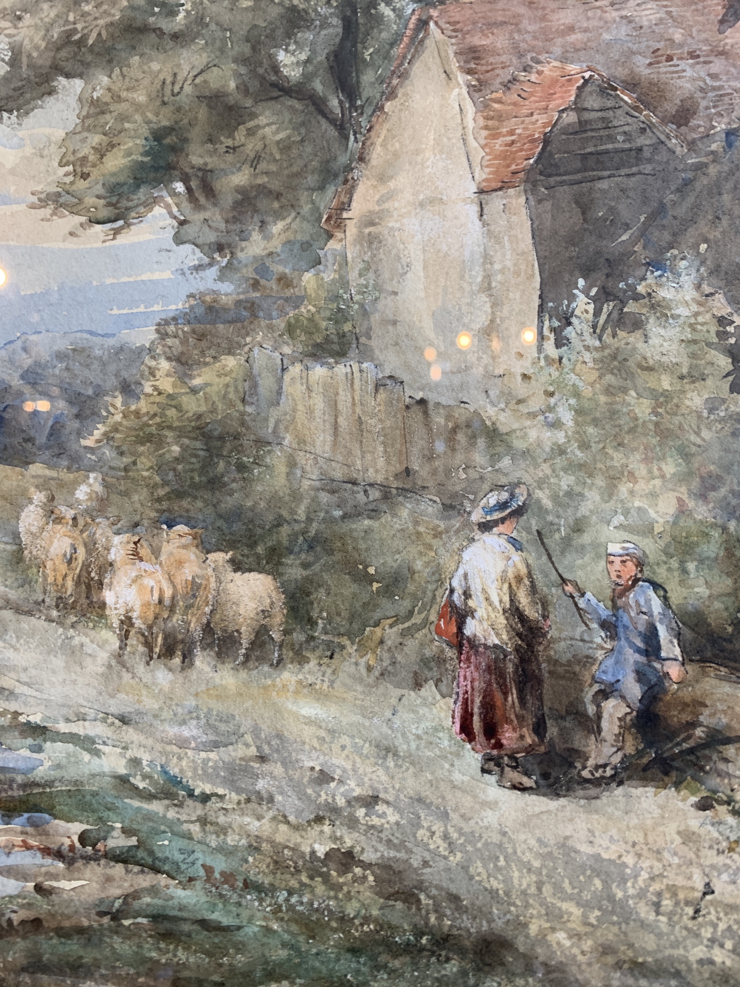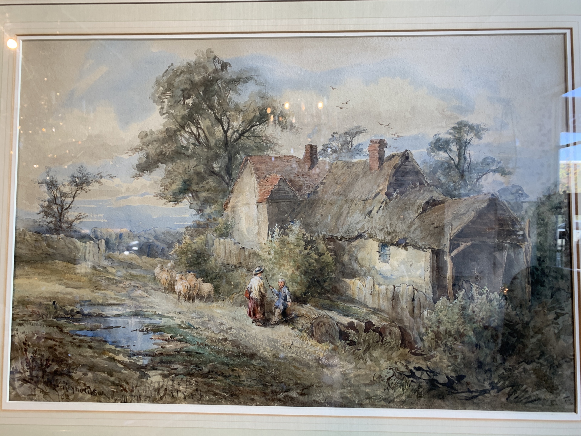 Victorian watercolour of a cottage scene by V. Reynolds.. c.1886 Gilt frame by Jarman.