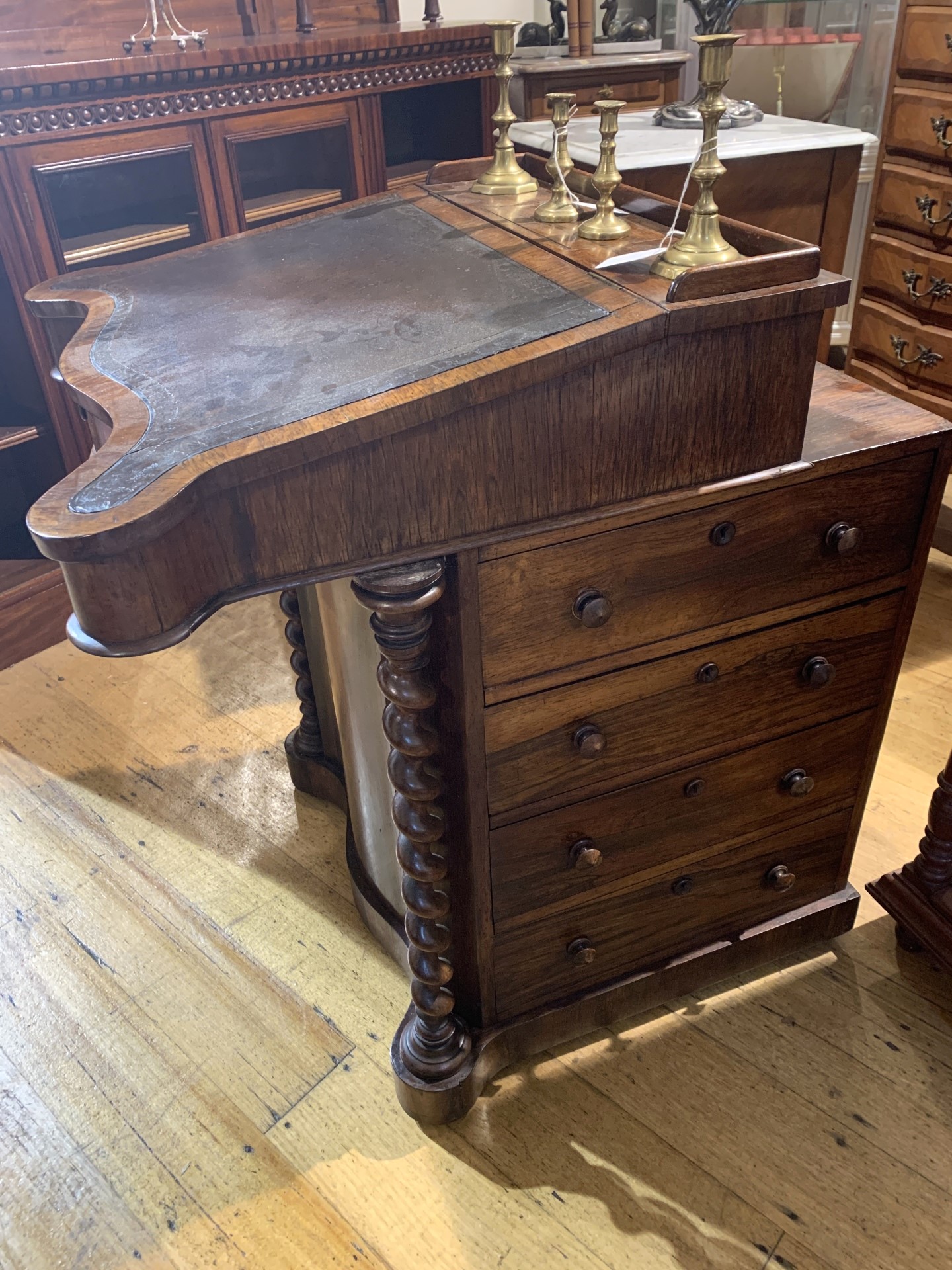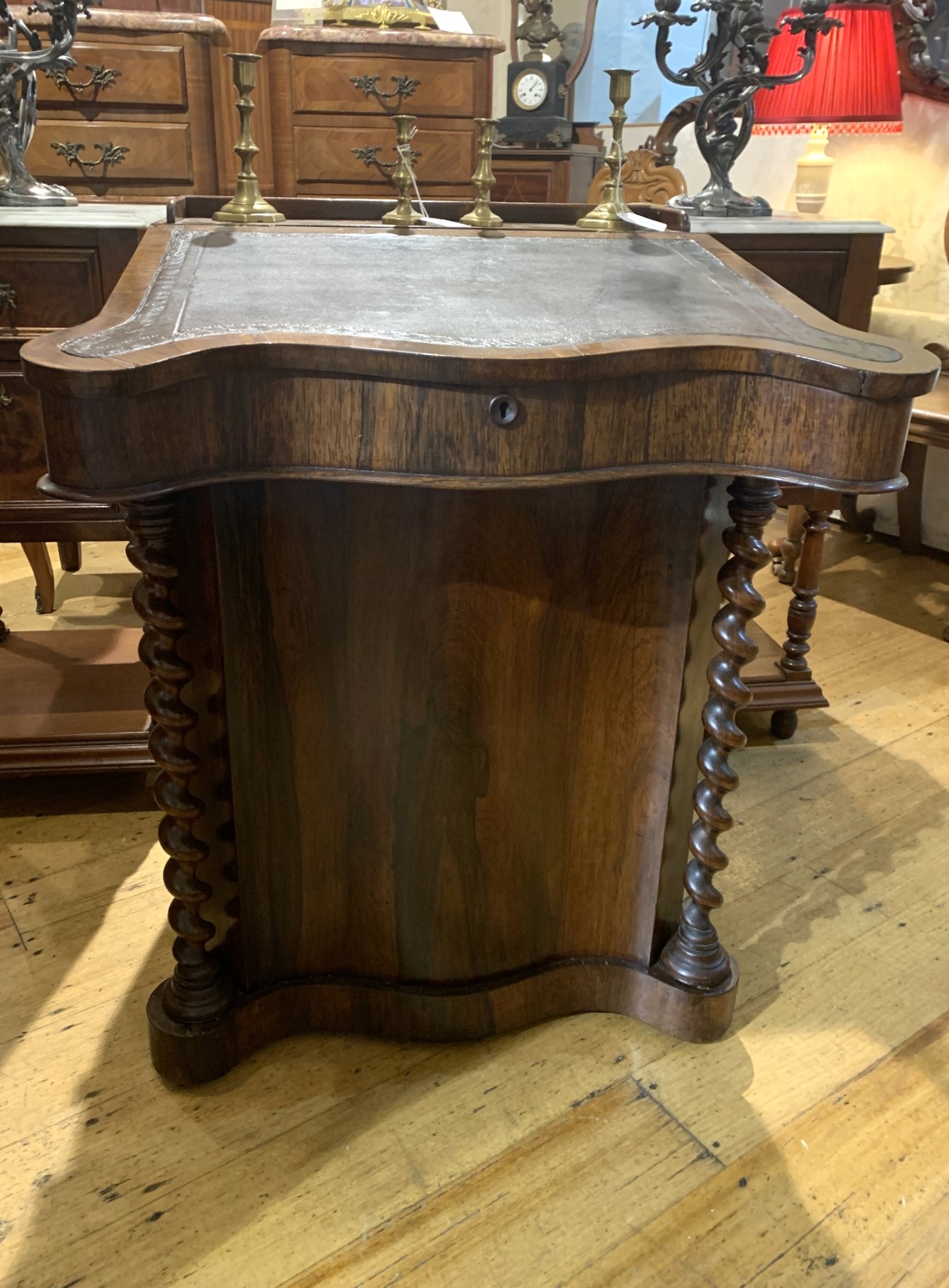 Early Victorian ahogany sliding top davenport with leather writing inset, Maple interior with pigeon holes and 4 drawers to right side. A serpentine front flanked by turned columns. c.1840-1850