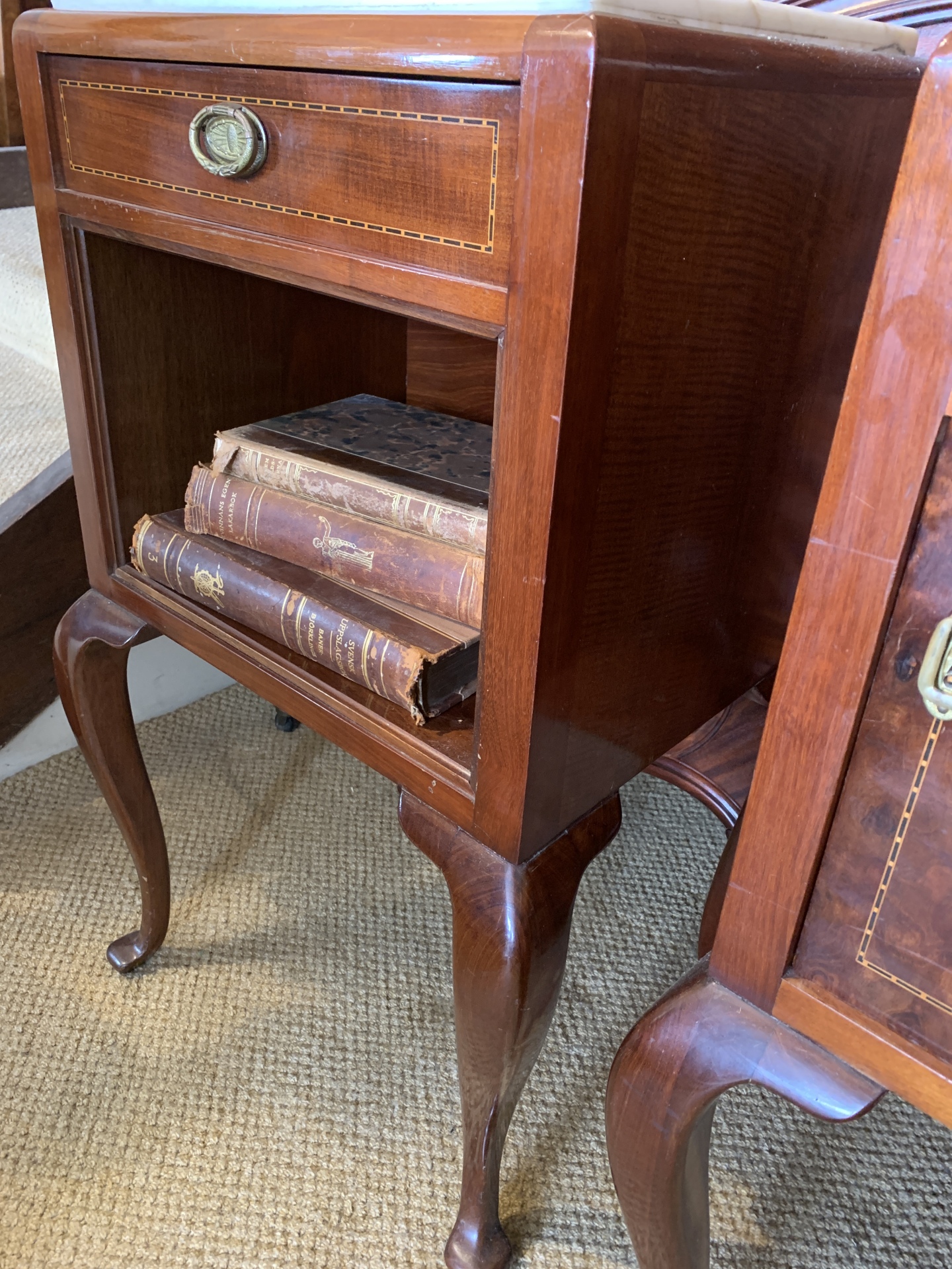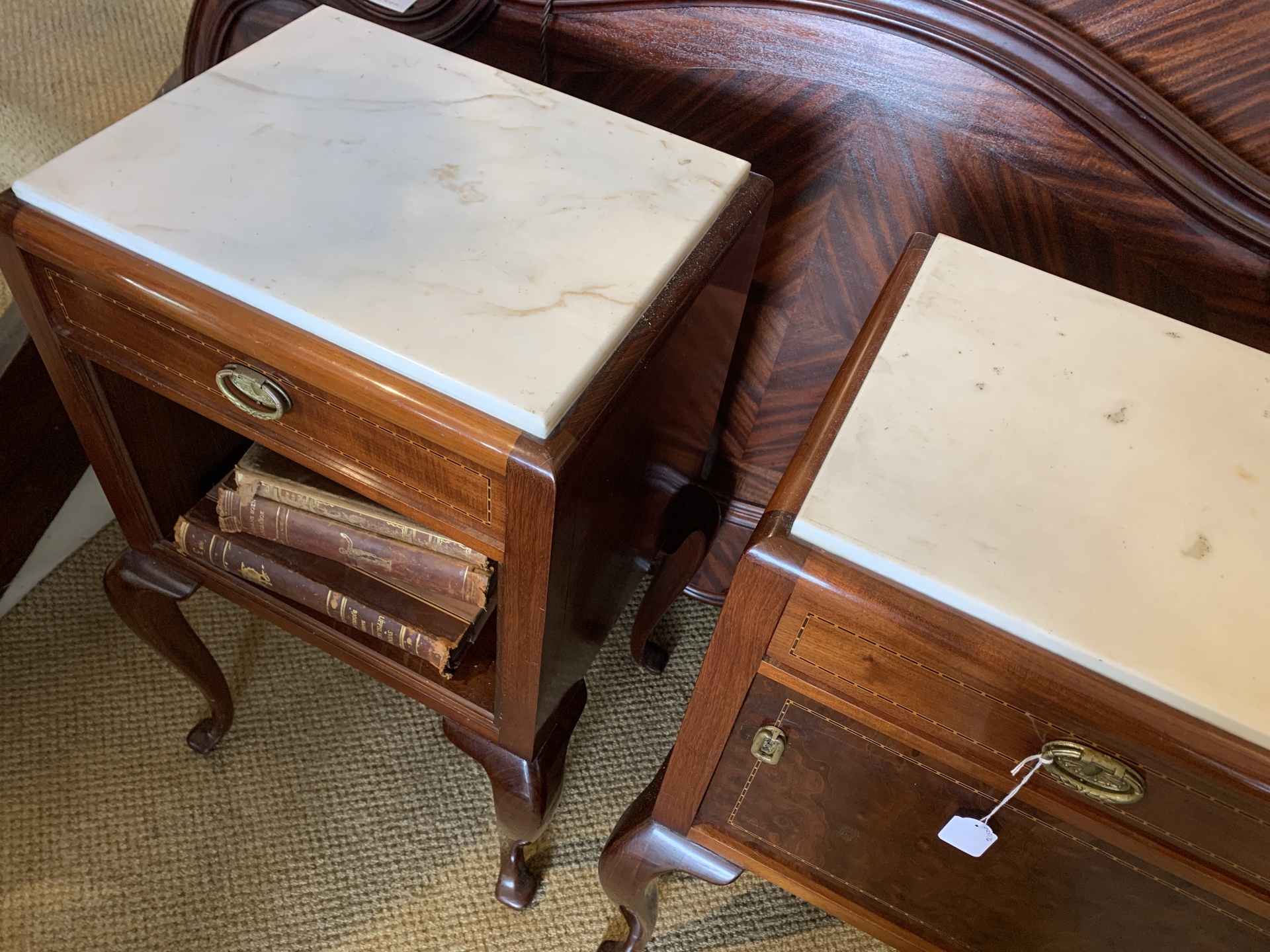 Pair of french marble topped mahogany bedside / lamp cabinets with cabriole legs. c.1930