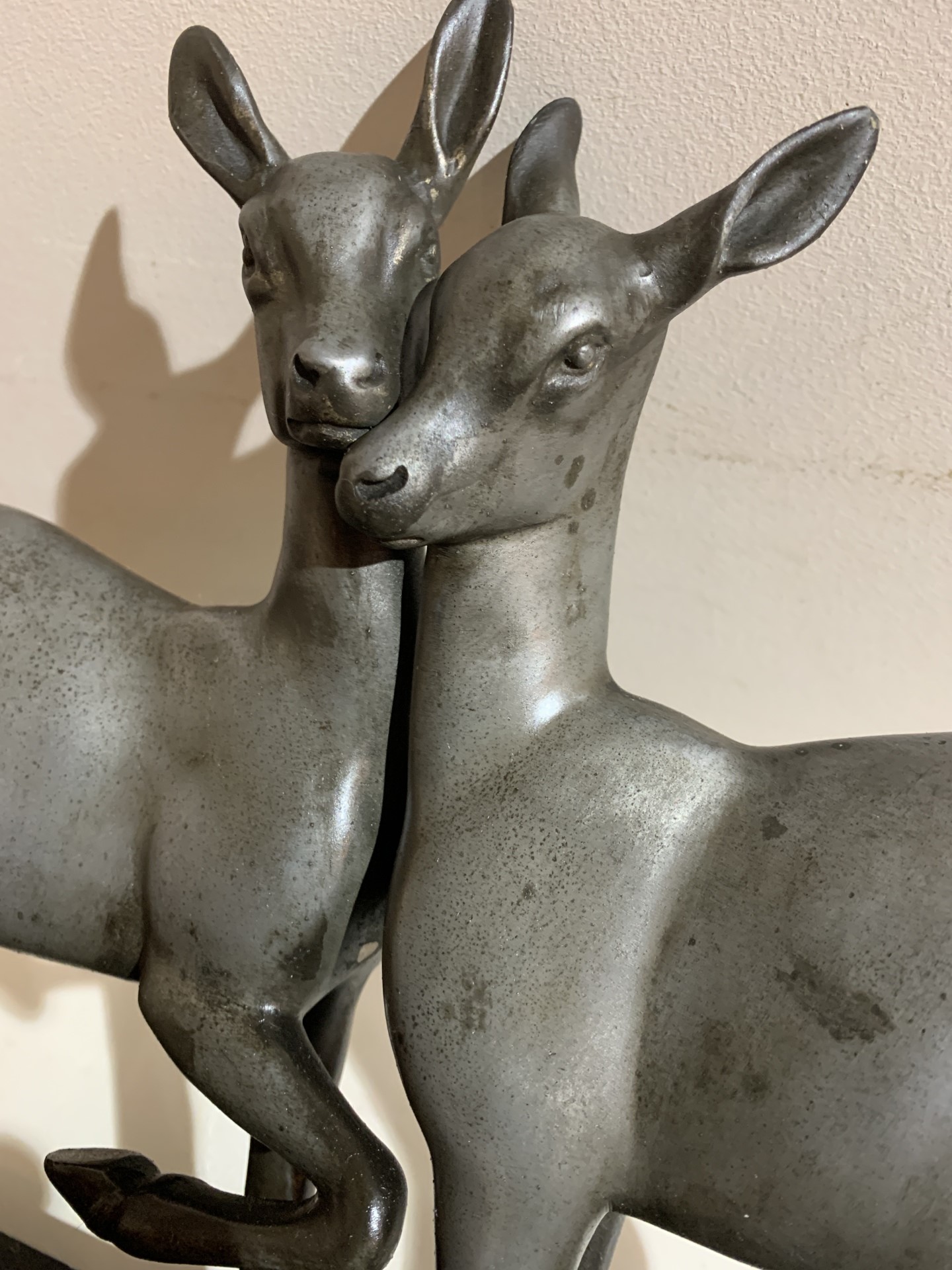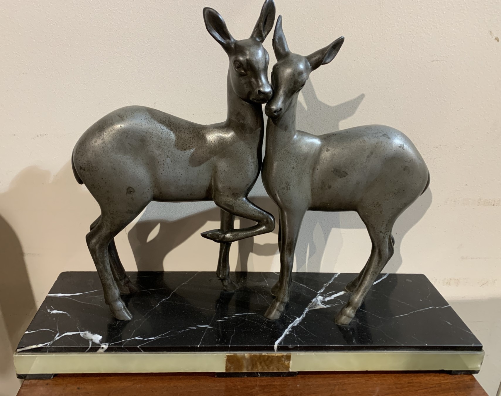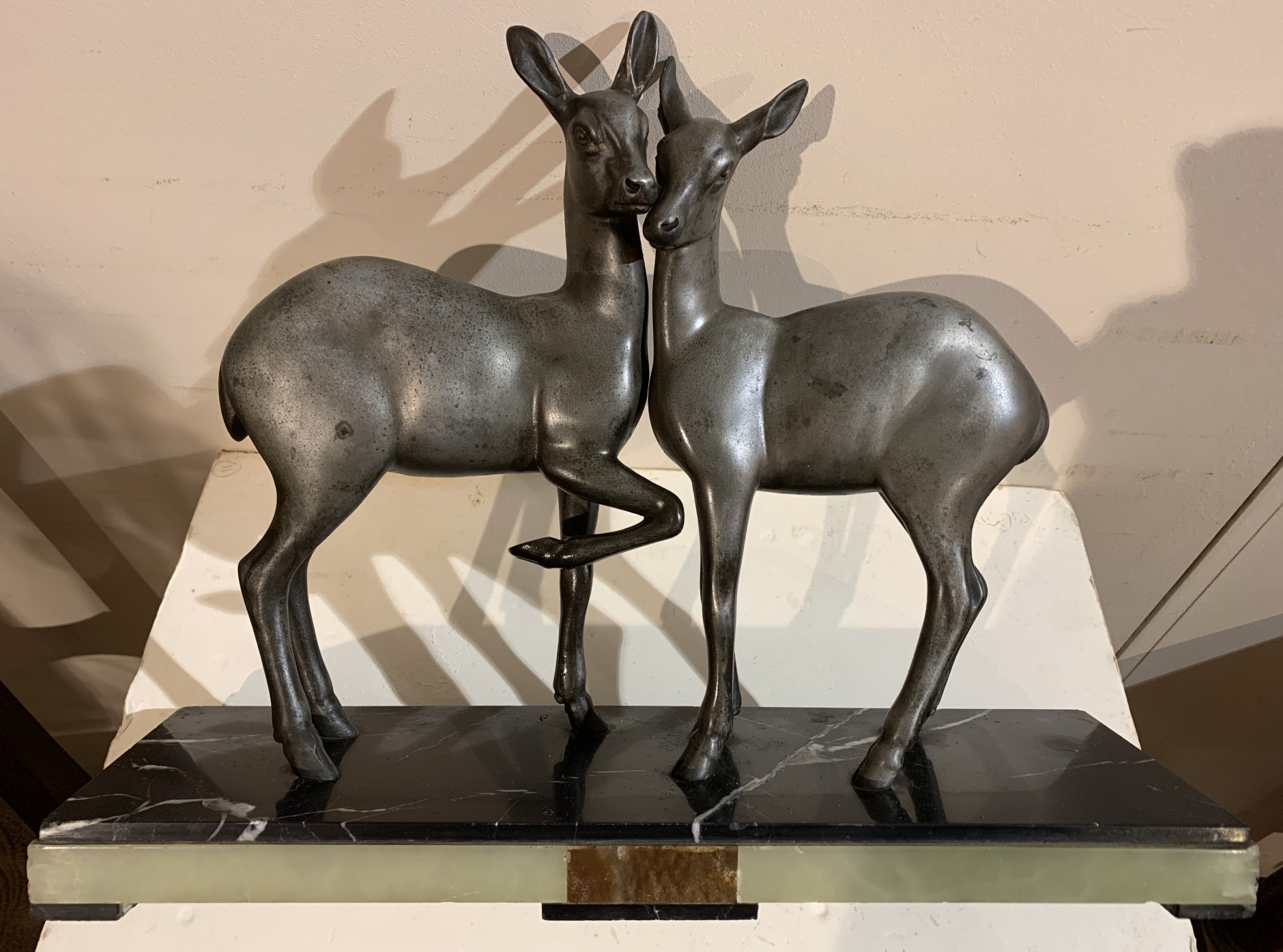 French Art Deco spelter deer on a marble and onyx base. c. 1930