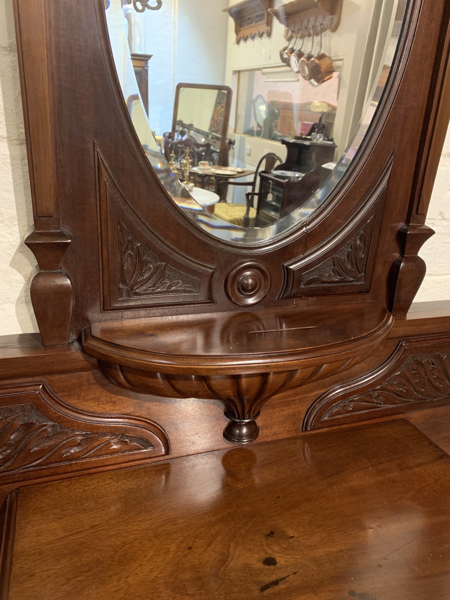 Late Victorian walnut hallstand with a central drawer and an oval beveled mirror. c.1890