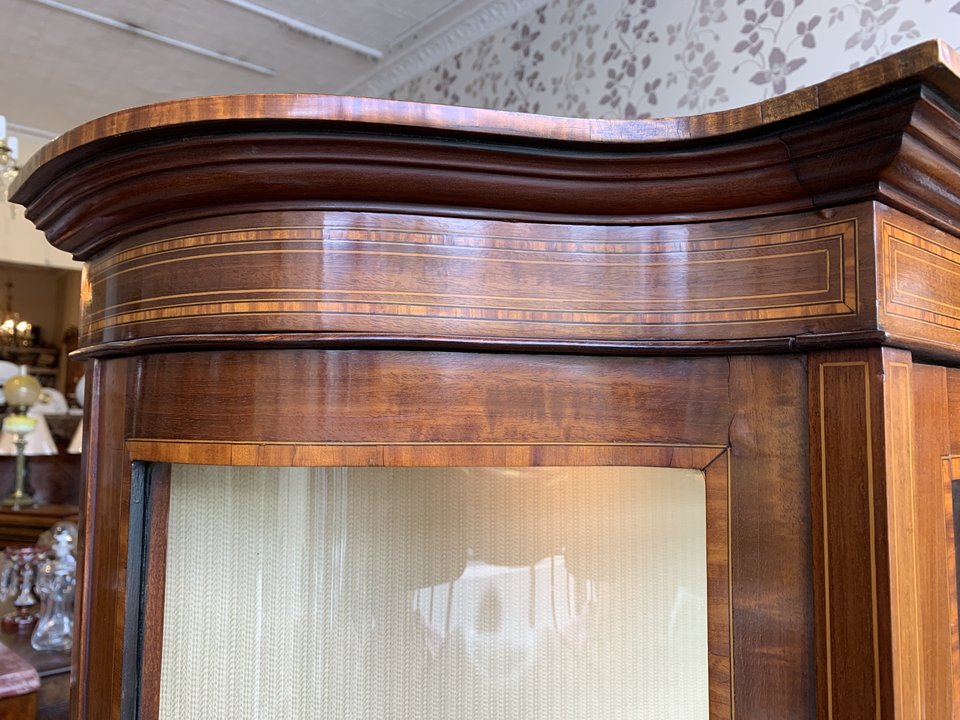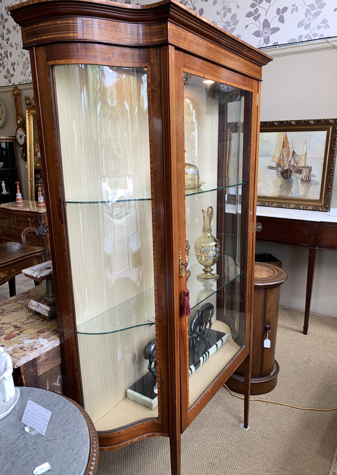 Late Victorian mahogany Sheraton Revival display cabinet with single central door and curved glass sides. c.1890-1900