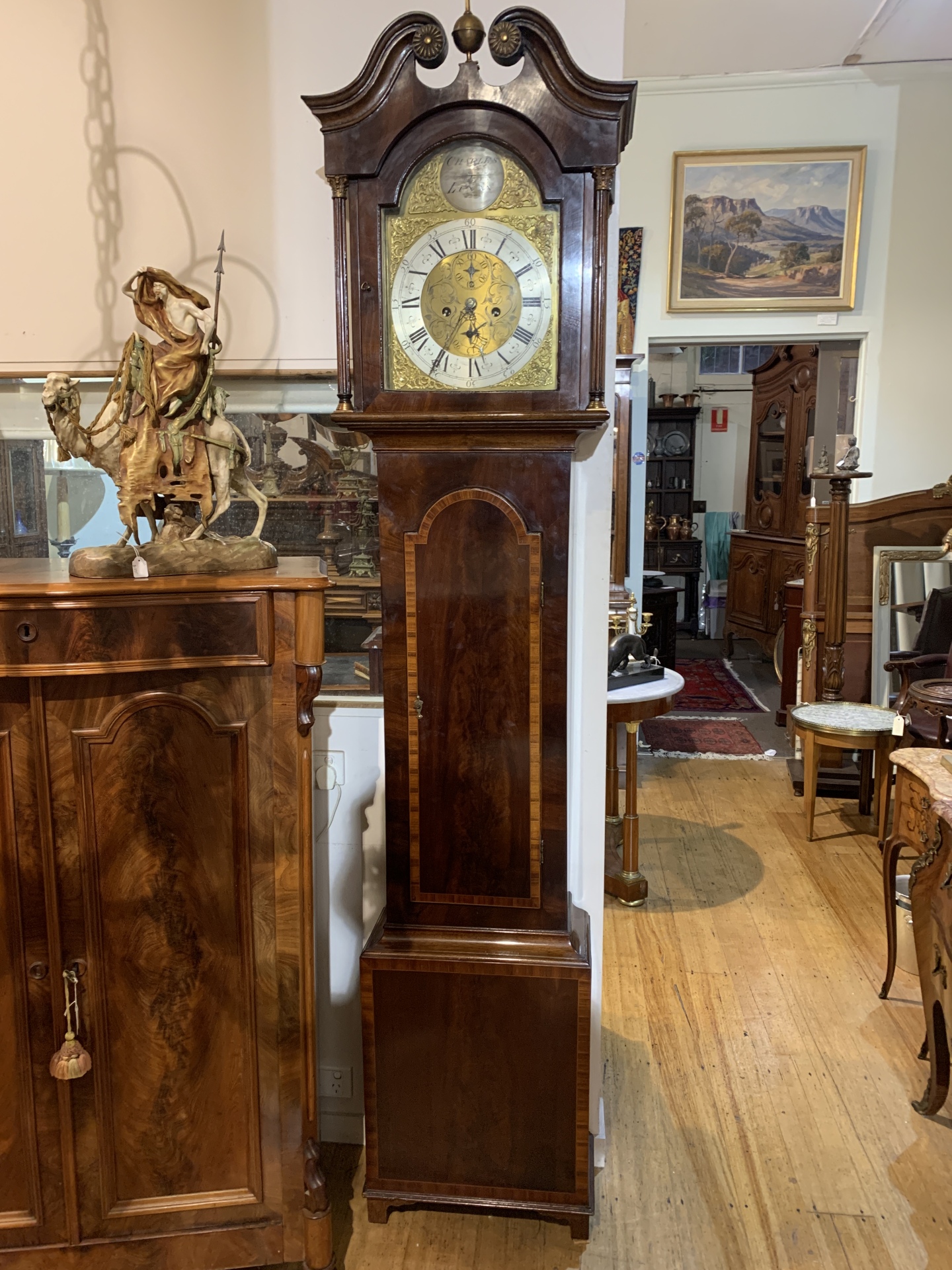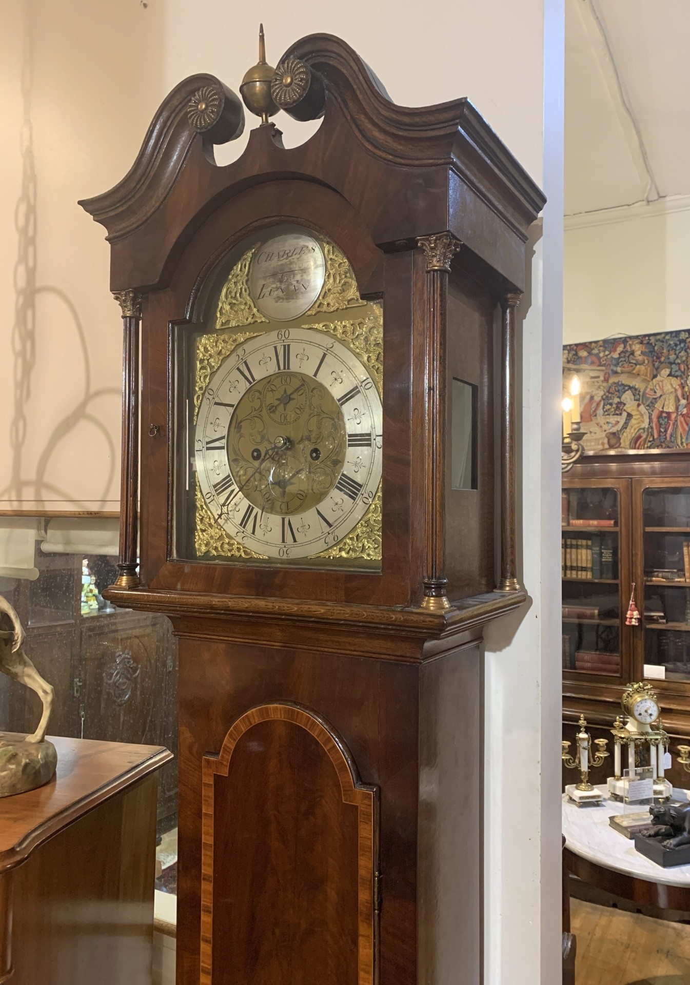 Georgian flame mahogany longcase clock with Charles Lunan 8 day movement, gilt brass finials & mounts,foliate ormolu mounts to dial, crossbanding to door & base, weights and pendulum. c.1790 Serviced movement.
