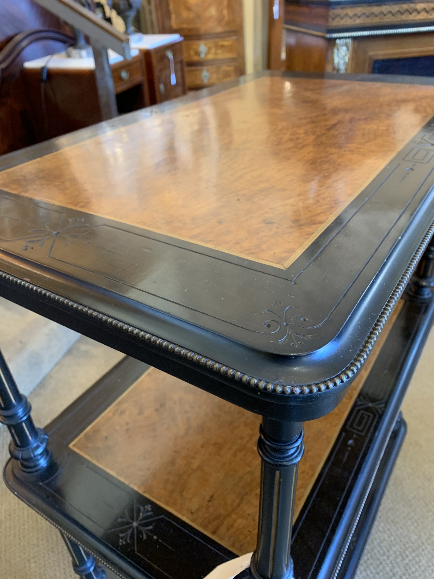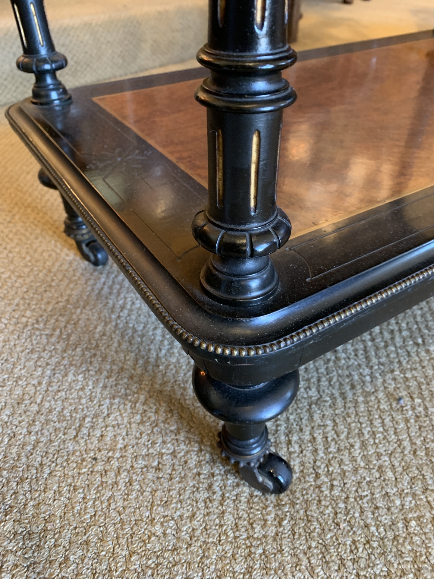 Quality Victorian 3 tier etagere with ebonised finish, brass beading,incised cross banding,amboyna panels,gilt fluted pillars and pocelain castors. c.1870