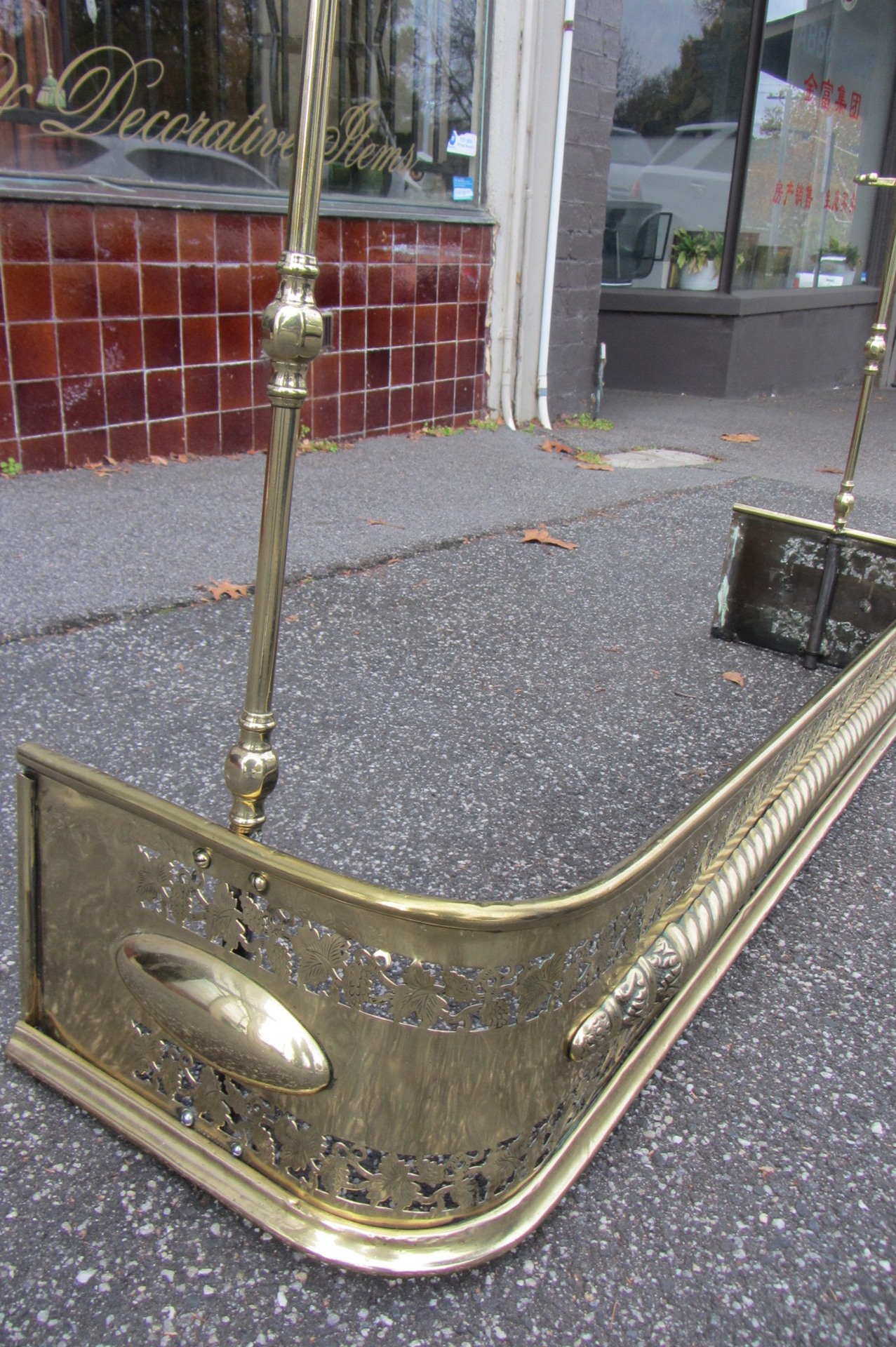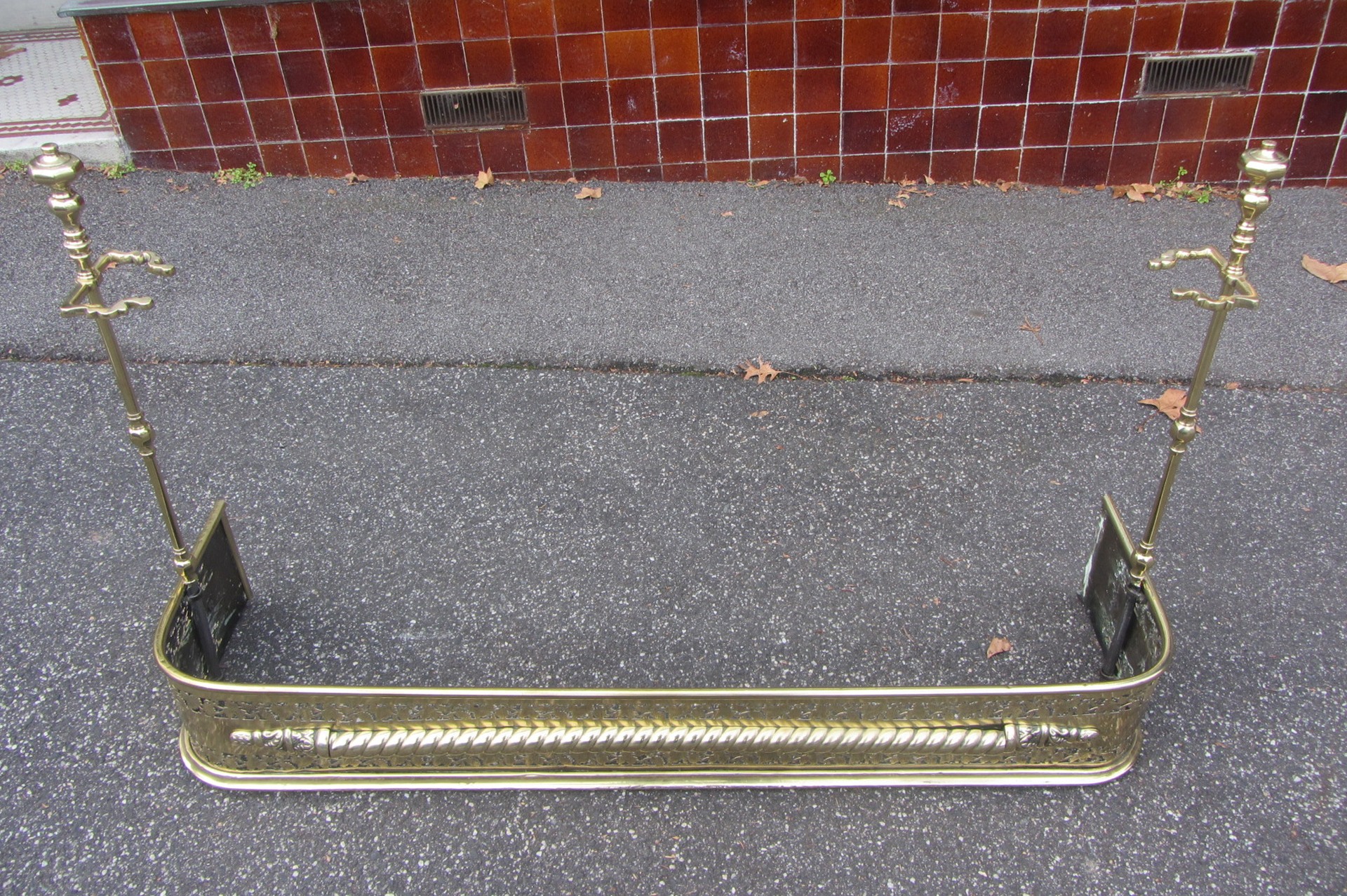 Georgian brass fire fender with pierced front and tool supports. c.1800 W-118cm D-31cm