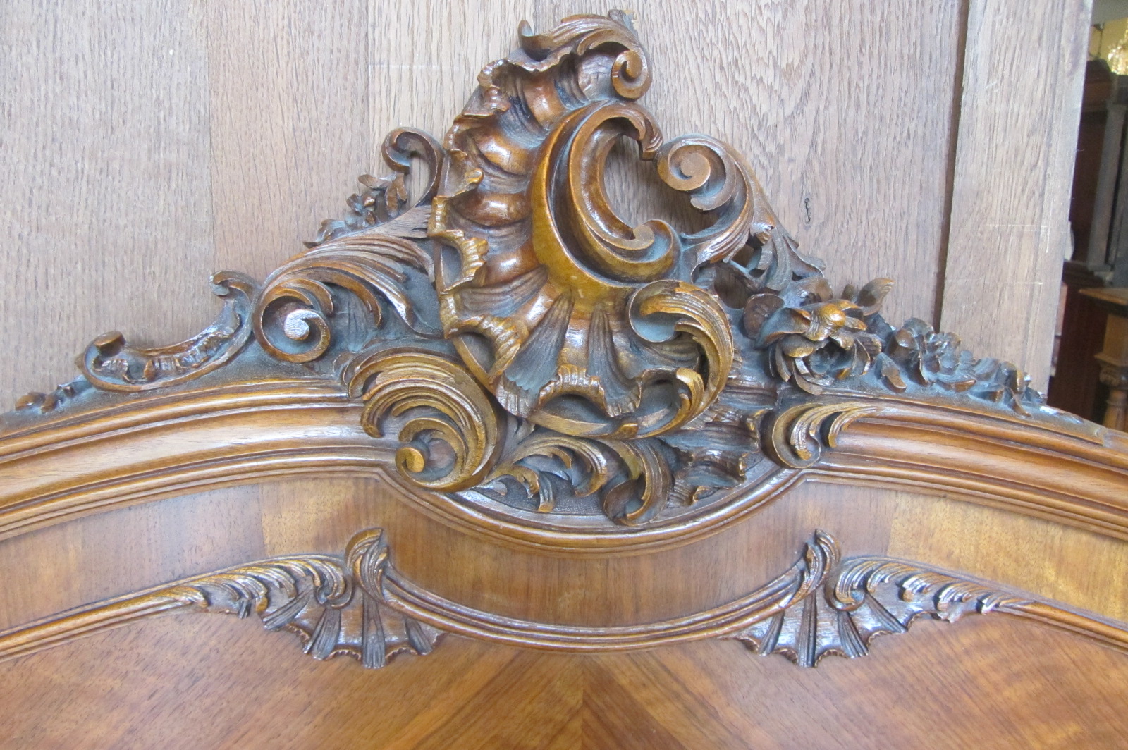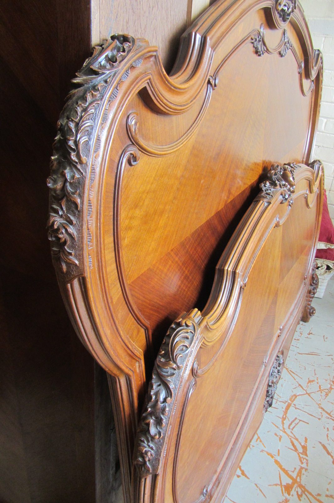French walnut Louis XV style bed with lovely carvings and extended rails to fit Queen size. Labelled Mercier Freres Paris c.1900