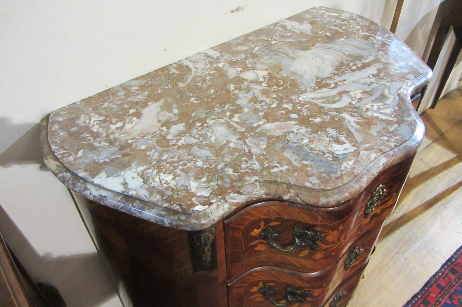 French Louis XVth style pallisander & floral marquetry marble top commode with 3 drawers and cast brass handles and mounts. c.1890 H-83cm L-80cm D-46cm