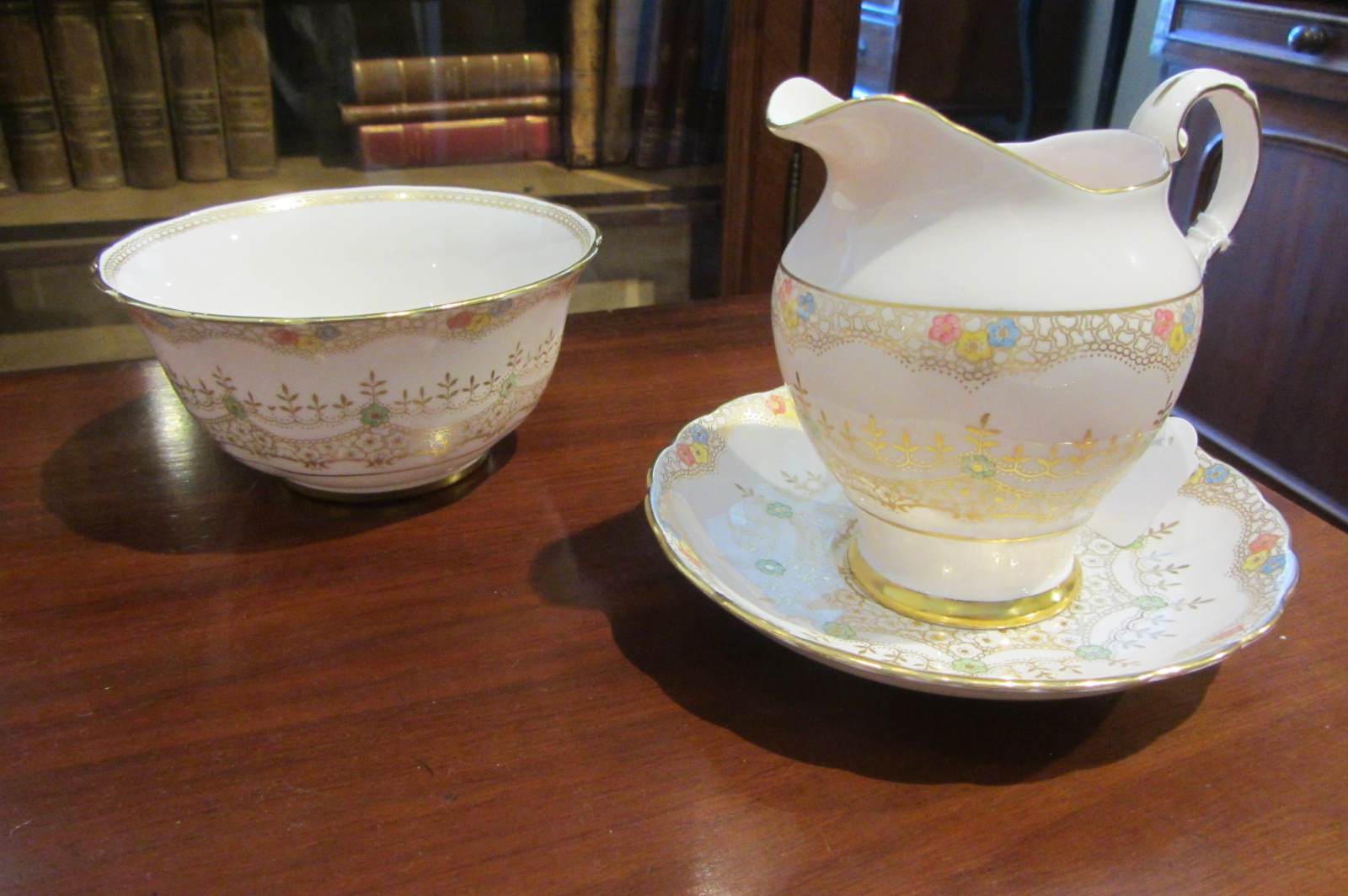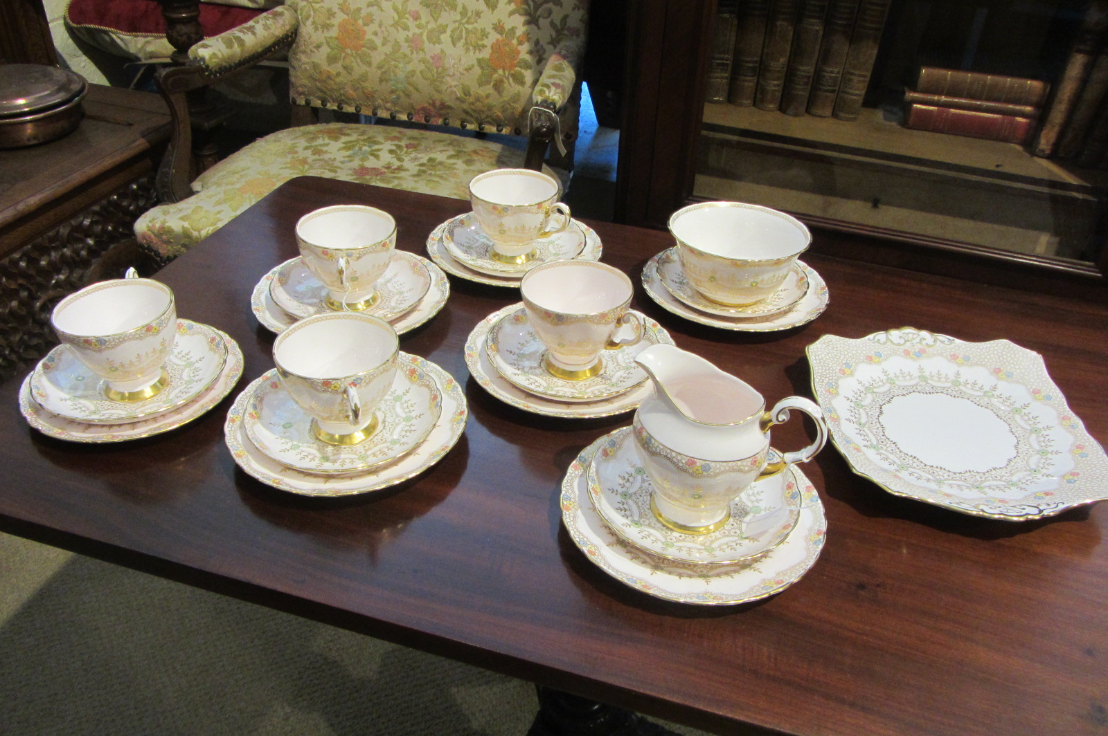Edwardian Tuscan part tea service with 5 cups & saucers, 7 plates, milk jug, sugar bowl and serving plate. ( 2 additional saucers) c.1910