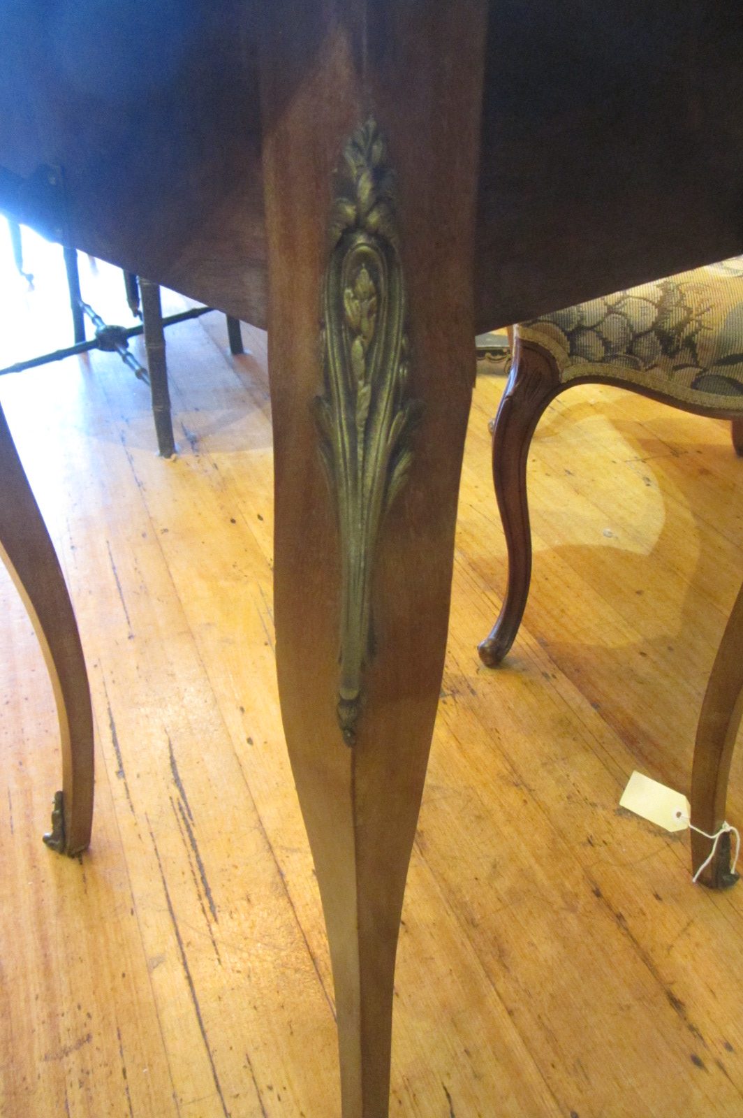 French rosewood and floral marquetry dropside table with brass trim and leg mounts. c.1890